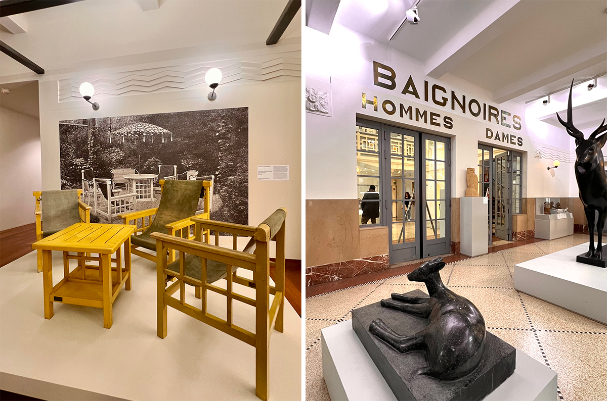 左:ロベール・マレ=ステヴァンスの家具を展示。 右:プールに加えて浴場があった名残がこの入り口の文字に見られる。photography: Mariko Omura