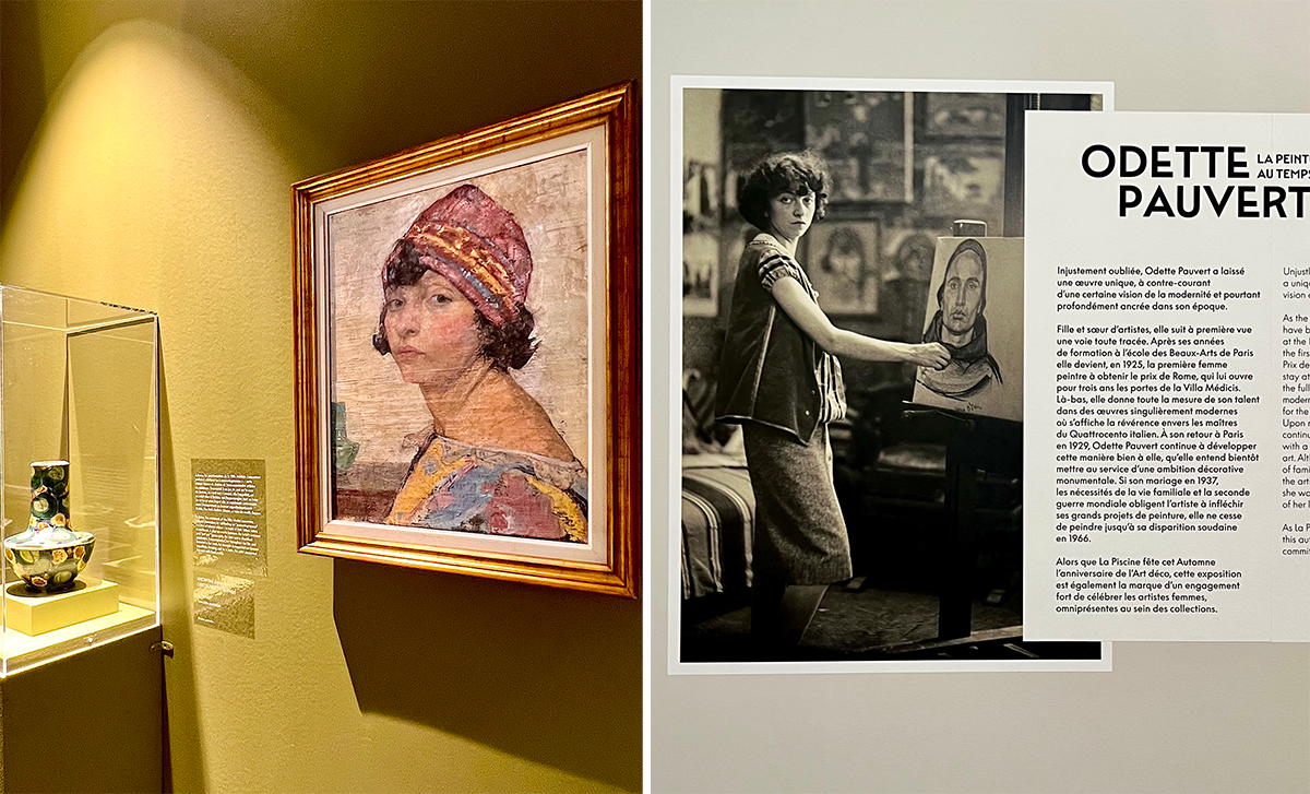 ラ・ピシーヌでは来年の1月11日までもうひとつの企画展『Odette Pauvert』展が開催中だ。こちら、副題はアール・デコの時代の野心の絵画とある。これは画家のオデット・ポヴェール(1903~1966年)が、1663年に創設されたローマ大賞を初の女性画家として『La légende de Saint Ronan』で得たのが、アール・デコ展がパリで開催された1925年であることからだ。画家の一家に生まれたオデット。この賞を得たことでヴィラ・メディチに3年間滞在することが可能となった。その後、大規装飾作品を制作したいという野望に燃えたものの、1937年に結婚し、また第二次世界大戦があり……戦後は古典主義を追求する彼女は時代を席巻する前衛の波とは折り合わず。輝かしい1925年の栄光にも関わらず忘れられる存在となってしまったのだ。ラ・ピシーヌは彼女の作品を再解釈し、当時のボザールの教育課程における女性の位置付けを検証することを目的にこの展覧会を企画。コレクションに遍在する戦間期の女性芸術家たちを称えるという、美術館としての意欲をここで表明している。