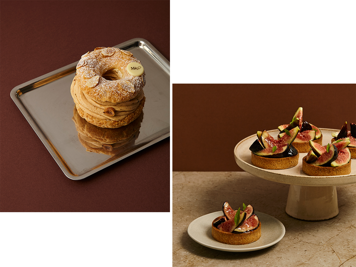 左:パリ・ブレスト。 右:イチジクのタルト(写真)や洋梨のラ・ブルダルーなど季節のフルーツのパティスリー。