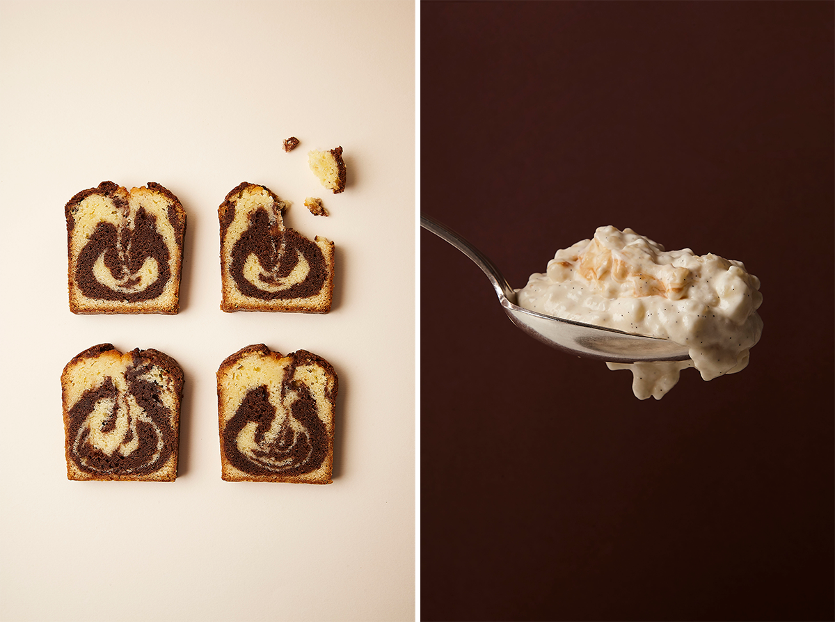 左:マーブルケーキ。 右:リオレやムース・オ・ショコラといった7区のファミリーの日曜のランチをおいしく締めくくるデザートも揃えている。