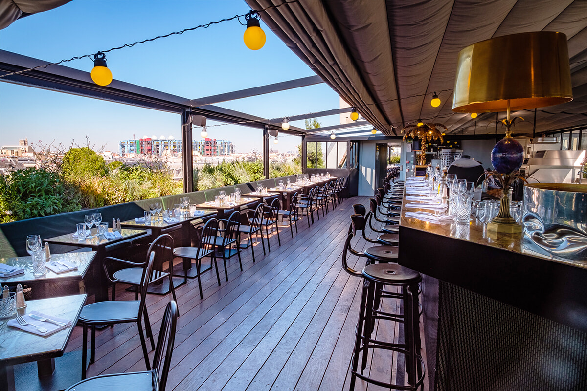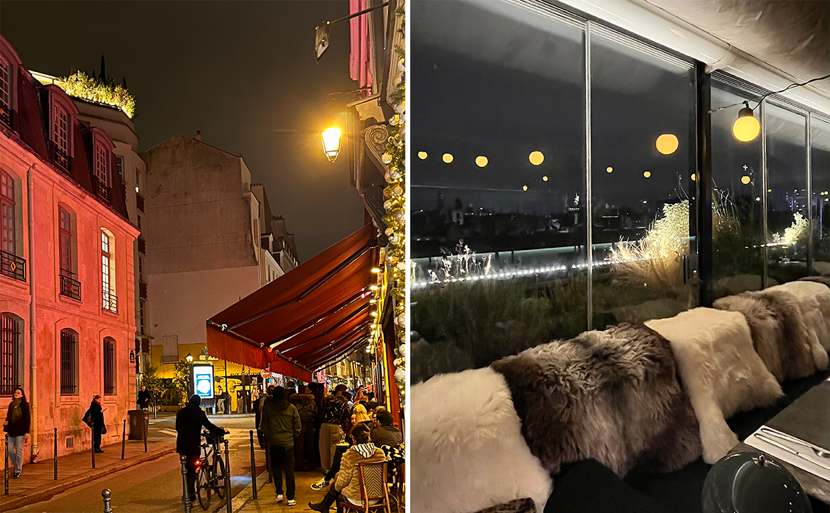 夏はオープンエアのルーフトップ。もちろん冬はしっかりと覆われていて、まるで火が焚かれてぽかぽかの山小屋の中にいるみたい。そんなレストランAu Top(オー・トップ)があるのは、マレ地区の建物の6エム・エタージュ、日本で言うところの7階だ。建物の上をぐるりと半周するように作られたルーフトップ・レストランの窓の外には、パリの景色がパノラマのように広がっている。