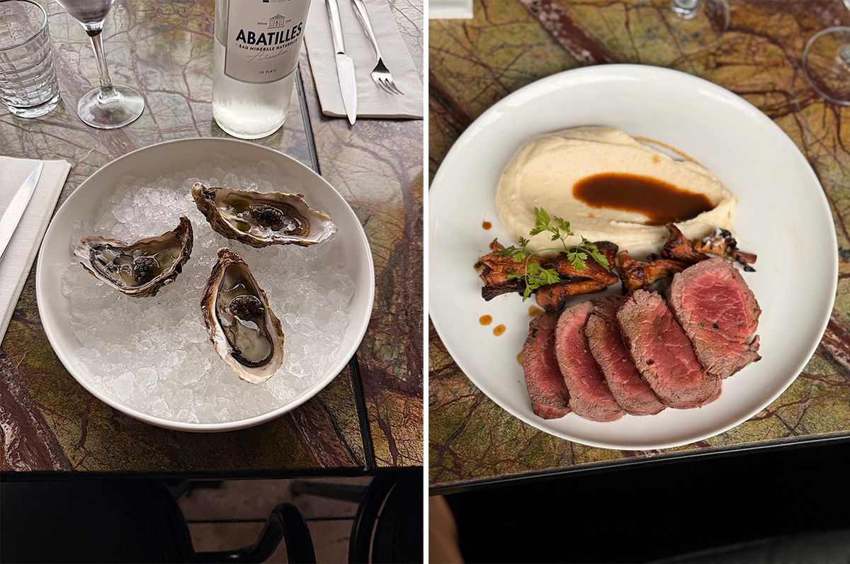 左:前菜の牡蠣は3個、6個、12個のチョイスがある(19〜48ユーロ)。 右:ランプ肉のステーキ(48ユーロ)。添えはセロリのピューレ、キノコソテー。