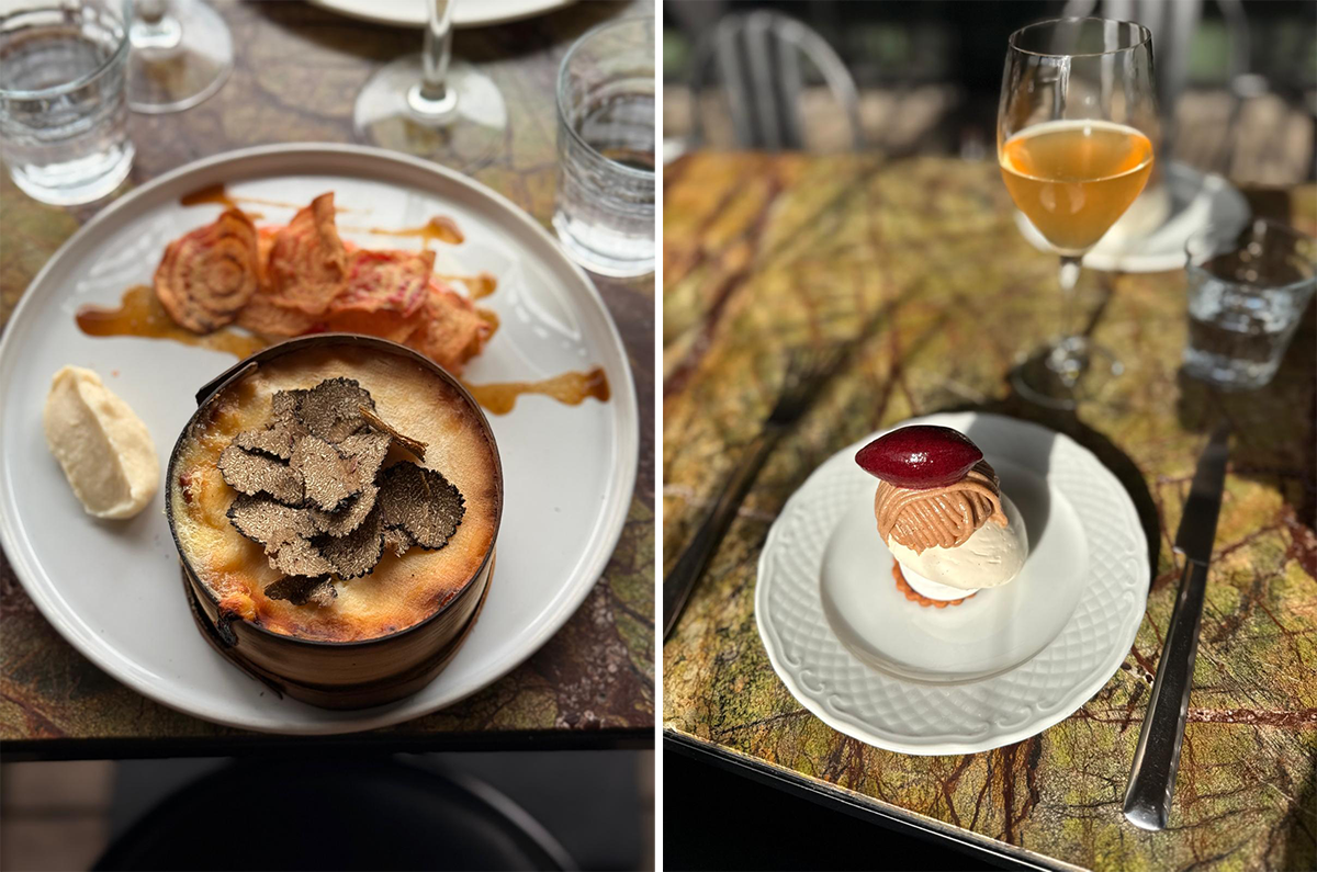 左:野菜のチップスとマルメロのジュレを添えたトリュフ乗せモンドール(48ユーロ)。 右:程よいボリュームのモンブラン。カシス・ミルティーユのシャーベットと。18ユーロ。