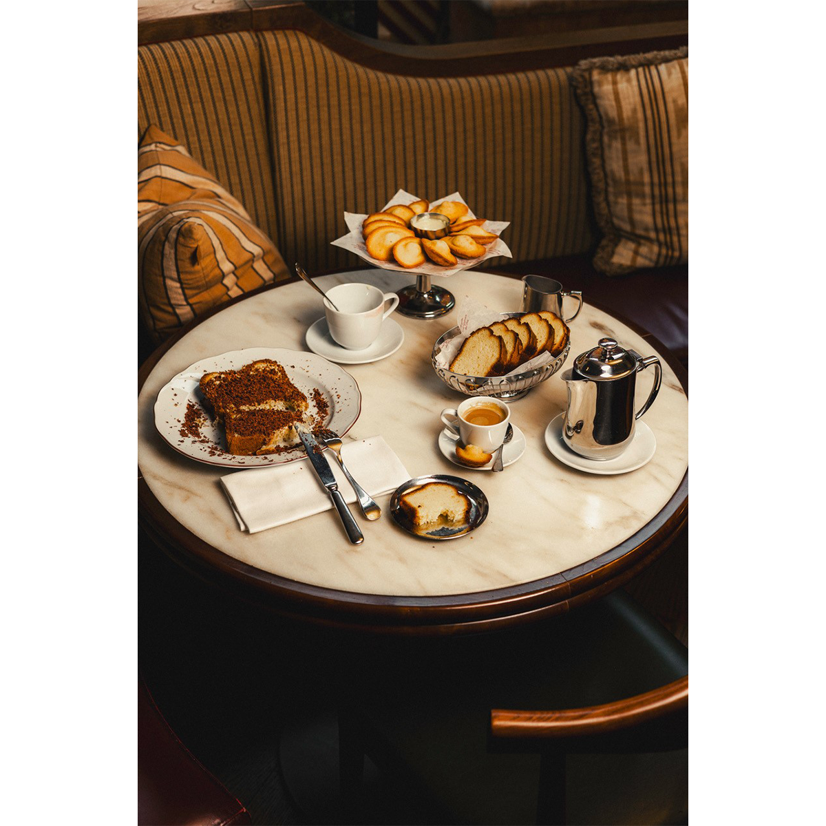 ランチタイムとアペリティフの間、ゆったりとした空間で甘い時間を過ごしたい、と思った時、地下鉄リュ・ドゥ・バック駅のすぐ前という立地のここはとても便利。おやつセットの内容は、マーブルケーキ、削ったチョコレートを乗せたブリオッシュのトースト、マドレーヌ2個、それにホットかフレッシュな飲み物である。セットは多すぎる、という場合、それぞれアラカルトでのオーダー(各6ユーロ)も可能だ。ホットドリンクのメニューにはピンク・ラテもチャイラテも見つけられるというように、飲み物の種類も充実している。