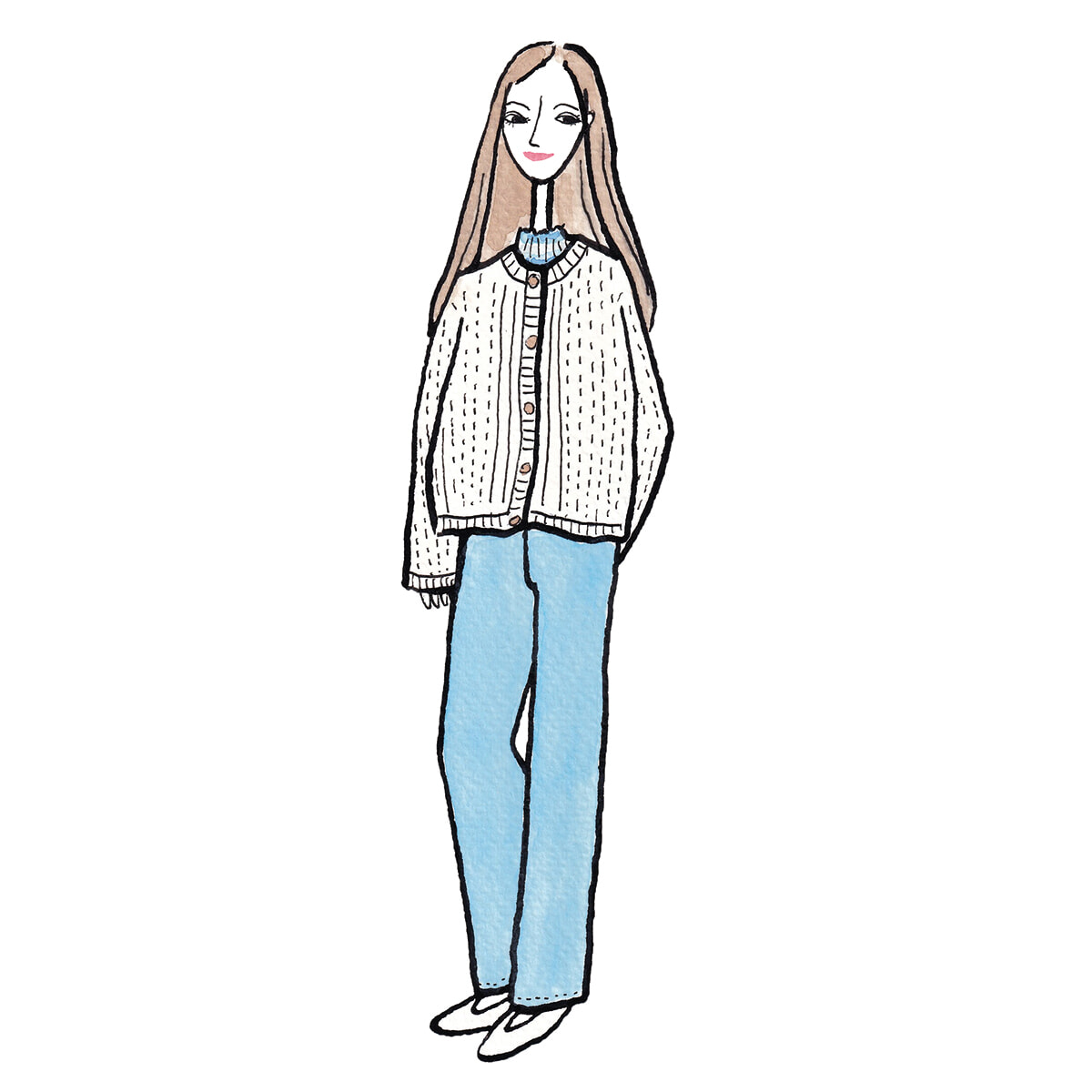 合わせやすいペタンコ靴が大好きで、色々なカラーと形を揃えています。日本に旅行したときには無印良品でホワイトのフラットシューズを買いました。ちなみにスニーカーはほとんど履いたことがありません。