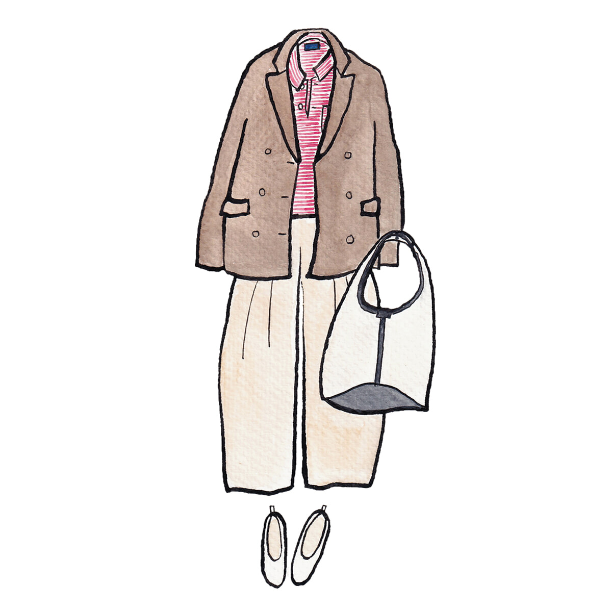 ジャケット、ポロシャツ(Polo Ralph Lauren)、パンツ(AMOMENTO)、フラットシューズ(Soeur)、キャンバス地のバッグ(Soeur)