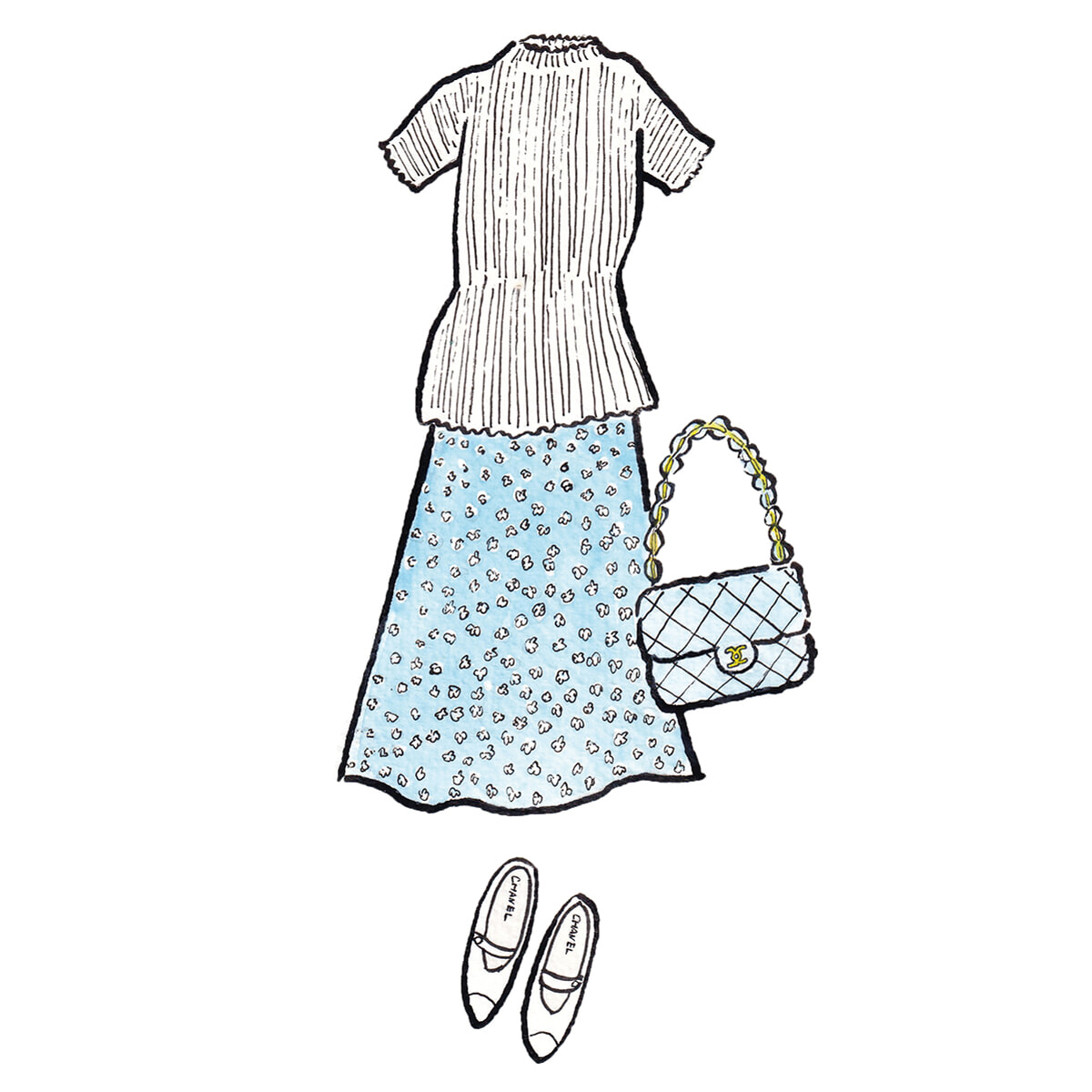 半袖ニット(RUS)、スカート(ハンドメイド)、フラップバッグ(CHANEL)、メリージェーン(CHANEL)