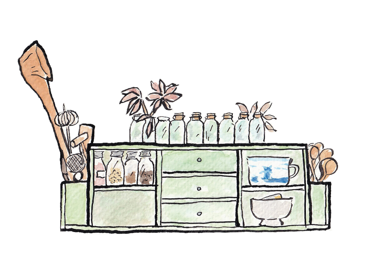 調味料や調理器具のための棚も両親が蚤の市で見つけてきたもの。私が幼い頃からこのアパルトマンにあって、一緒に年月を重ねてきました。