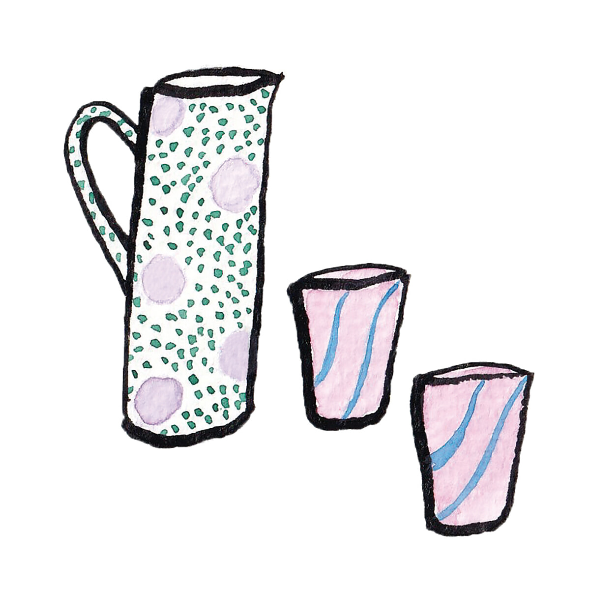 手描きのドットがキュートなピッチャーと、ピンクのグラスはTableのもの。どれも職人さんの手仕事で作られているものばかりです。