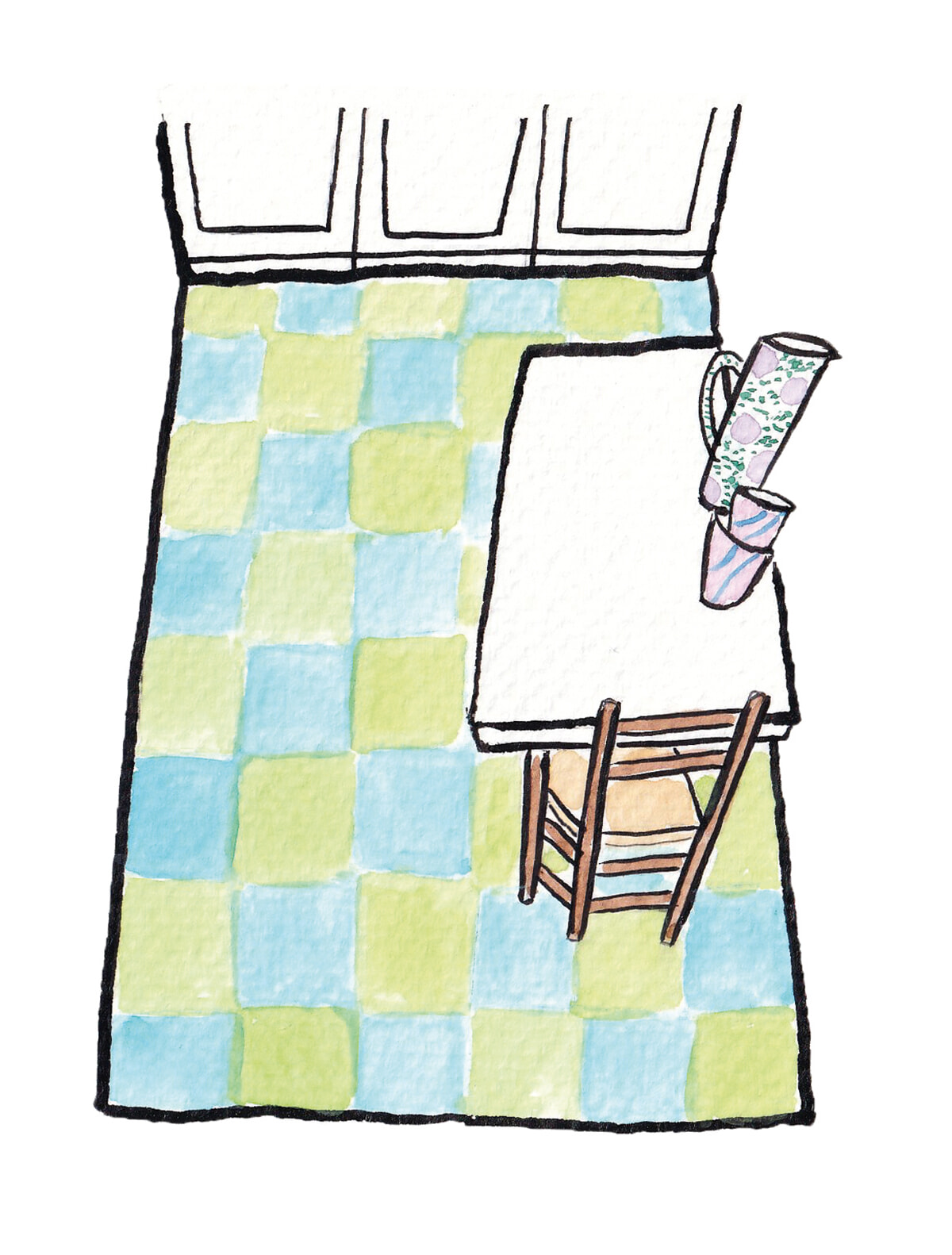 小さめながらも機能的で使いやすいキッチン。ブルーとグリーンの格子柄の床タイルとラタンチェアがお気に入りです。