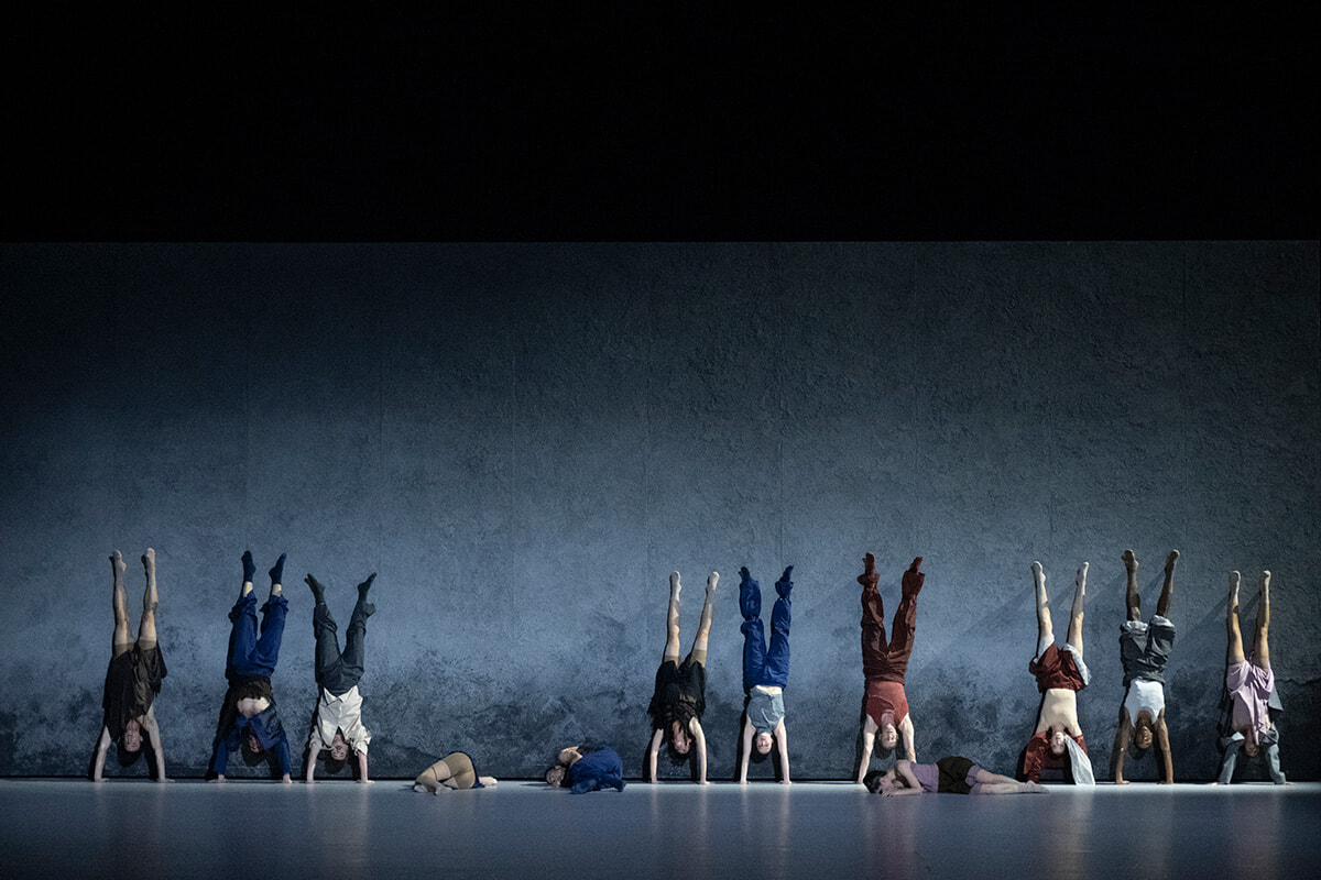 『Drift Wood』に配役されたダンサーたち。前列左から、バティスト・ベニエール、タケル・コスト、ルー・マルコー=ドゥルアール、ミカエル・ラフォン。後列左からキャロリーヌ・オスモン、エリック・ピント=カタ、イダ・ヴィイキンコスキー、マリオン・ゴティエ・ドゥ・シャルナッセ、イヴォン・ドゥモル、セーホー・ユン、アデル・ベレム、ジェニファー・ヴィゾッキ、クレモンス・グロ。©Benoîte Fanton/ OnP