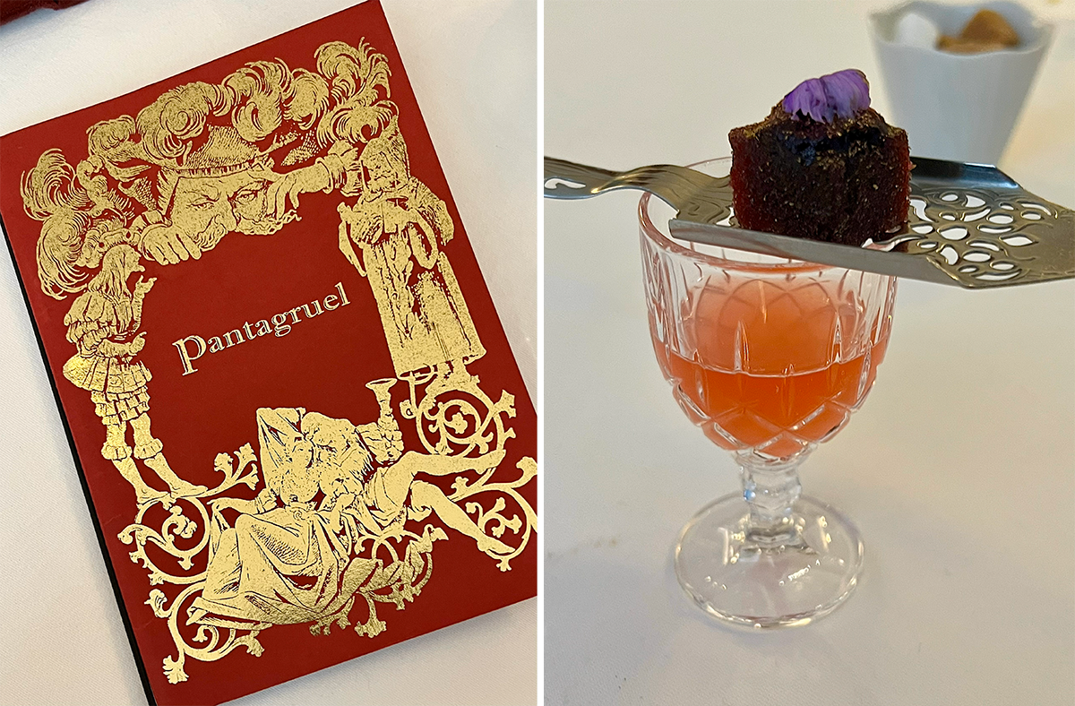 左:食事の始まり。まずこのメニューから。 右:食事の締めくくり。グリーンではなくピンク色した21世紀のノンアルコール・アブサント。ハイビスカスとルイボスなどのハーブティーにアブサントを飲むときに角砂糖をのせるスプーンに、カシスの角型パート・ド・フリュイを乗せて。パンタグリュエルでのお祭り気分の時間が終了。photography: Mariko Omura