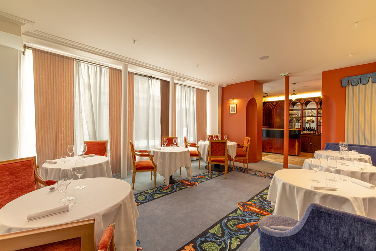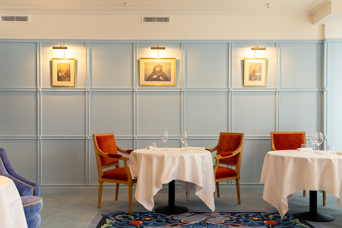 300平米という広い店内のインテリアを任されたのはフィリップ・メディオニ。中世のインスピレーションからイヴ・クライン・ブルーという20世紀まで時代の旅である。パンタグリュエルは16世紀にフランス人作家ラブレーが書いた長編『ガルガンチュアとパンタグリュエル』の登場人物で、巨人で大食漢のガルガンチュアの息子がパンタグリュエルという設定だ。壁にはこの小説の挿絵となったギュスターヴ・ドレの版画が額に収めれ、壁を飾っている。壮大でファンタジーあふれるパンタグリュエルの物語は、シェフを大いに魅了したのだ。中世を感じさせる淡いブルーの壁に包まれた空間で、壁の額と同様に視線を捉えるのは色鮮やかなカーペットである。これもブルーが基調なのだが、周囲のモチーフはオマール、野ウサギ、アーティチョークなどの食材。聞くと、これはシェフが調理するのが好きな素材なのだという。