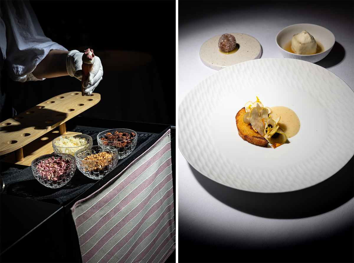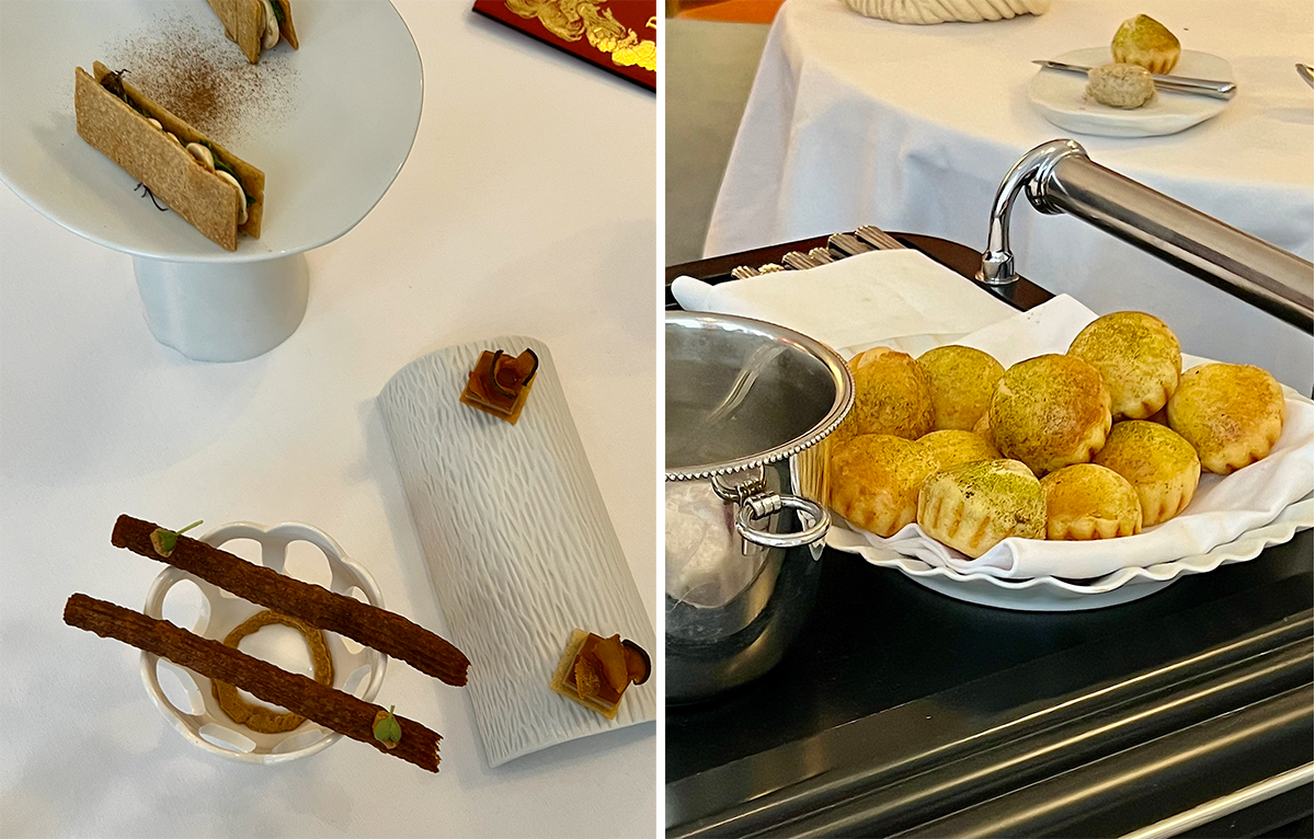 左:いよいよ食事の始まり。まずはアミューズ・ブーシュから。フランス産の3種のきのこをチュロス、ジュレ、サンドで。 右:シェフ・パティシエのブノワ・コストはパンも担当。よそのテーブルに運ばれるのを見ただけで気をそそられる青海苔を乗せたバター控えめのブリオッシュ。卵料理用に合わせたクリエイションで、海苔と味噌をミックスしたバターが添えられる。photography: Mariko Omura