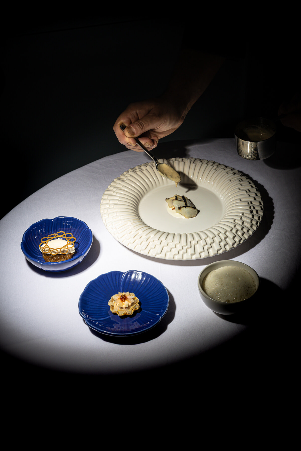 ランチおよびディナーの5章からなるMenu Gargamelleの第1章である「帆立貝、そば、ロスコフの玉ねぎ」を例にとろう。メインとなるのは軽く火を通した帆立貝に、ペッパーソース。”衛星”たちは、オニオンのコンポートとホタテのひも、蕎麦のリゾットにオキシダティヴ・ワインのエマルジョン、ホタテのタラマのミニタルトだ。大小4皿がテーブルに並ぶと、それだけで華やかで楽しい気分になる。シェフが経験で培った調理の技と溢れ出るクリエイティビティを駆使した料理の味わい深さに、さらに食卓の賑わいがおいしさをプラスするよう。このコースでは第二章がいけじめの鯛、セロリ、コック貝、うなぎ。第3章がビーフ、人参、牡蠣。鯛やビーフも”衛星”皿たちと共に登場するのだ。