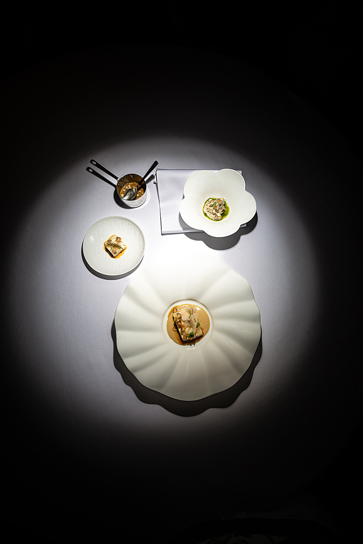 「帆立貝、ソバ、ロスコフのオニオン」はブルターニュづくしの宇宙だ。植物炭が黒く描く帆立貝のフレームがグラフィックだ。この料理にソムリエが選んだのは、ロワール渓谷のビオディナミック白ワインであるTerre de l’EluのBastingage。©ilyafoodstories
