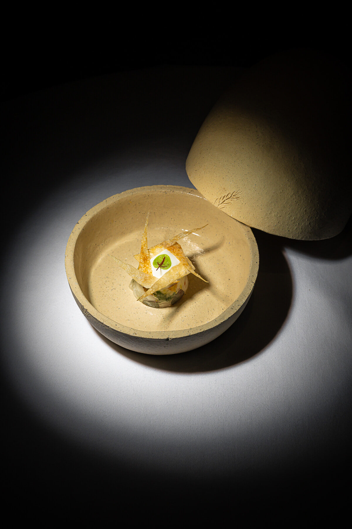 シェフのクリエイティビティが日本人客にわかりやすいのは、プロローグとして登場するL’Oeuf pantagruélique(ルフ・パンタグリュエリック)だろう。大きなたまご型の陶製の器がキッチンからテーブルにやってくる。蓋を開けると……シェフが日本で食べて感動した”卵かけ御飯 »から発想し、ライスはスフレにしてカリッと、そして卵の黄身はマリネして膜を作って、とテクスチャーを少しフランス料理化して完成させた逸品である。食べてのお楽しみ!