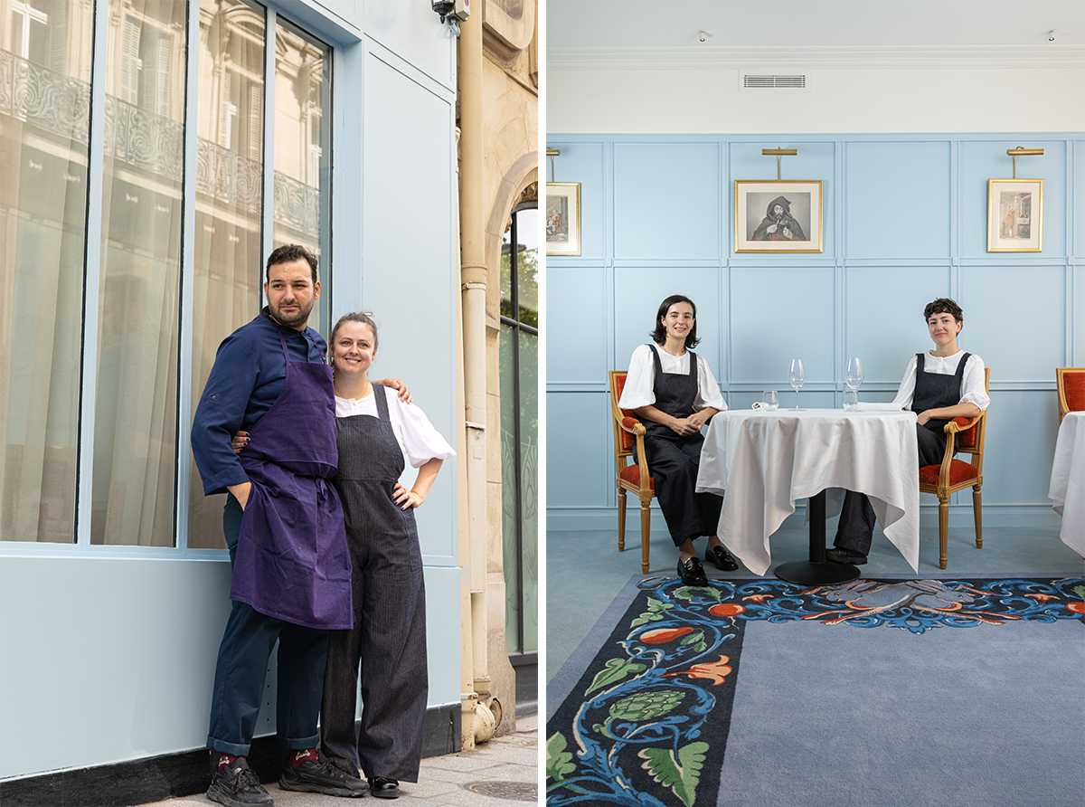左:感動と寛大を大切に料理するシェフ、ジャゾン・グジィ。右はシェフのパートナー。 右:ソムリエのキャロリーヌ・ジュエ(右)もサービスのチーフであるカミーユ・スケルシオニも28歳という若いチームだ。シェフ以下、スタッフ全員がデニムのユニフォーム! ©ilyafoodstories