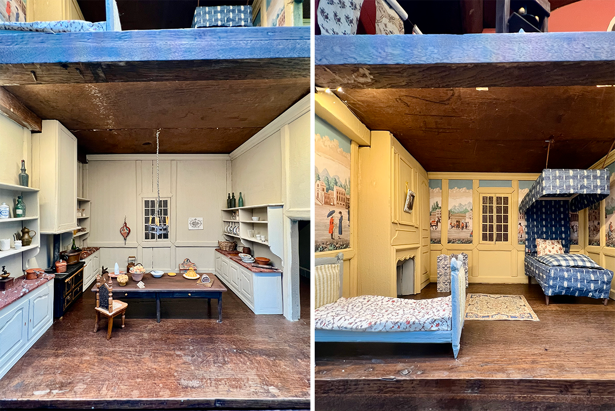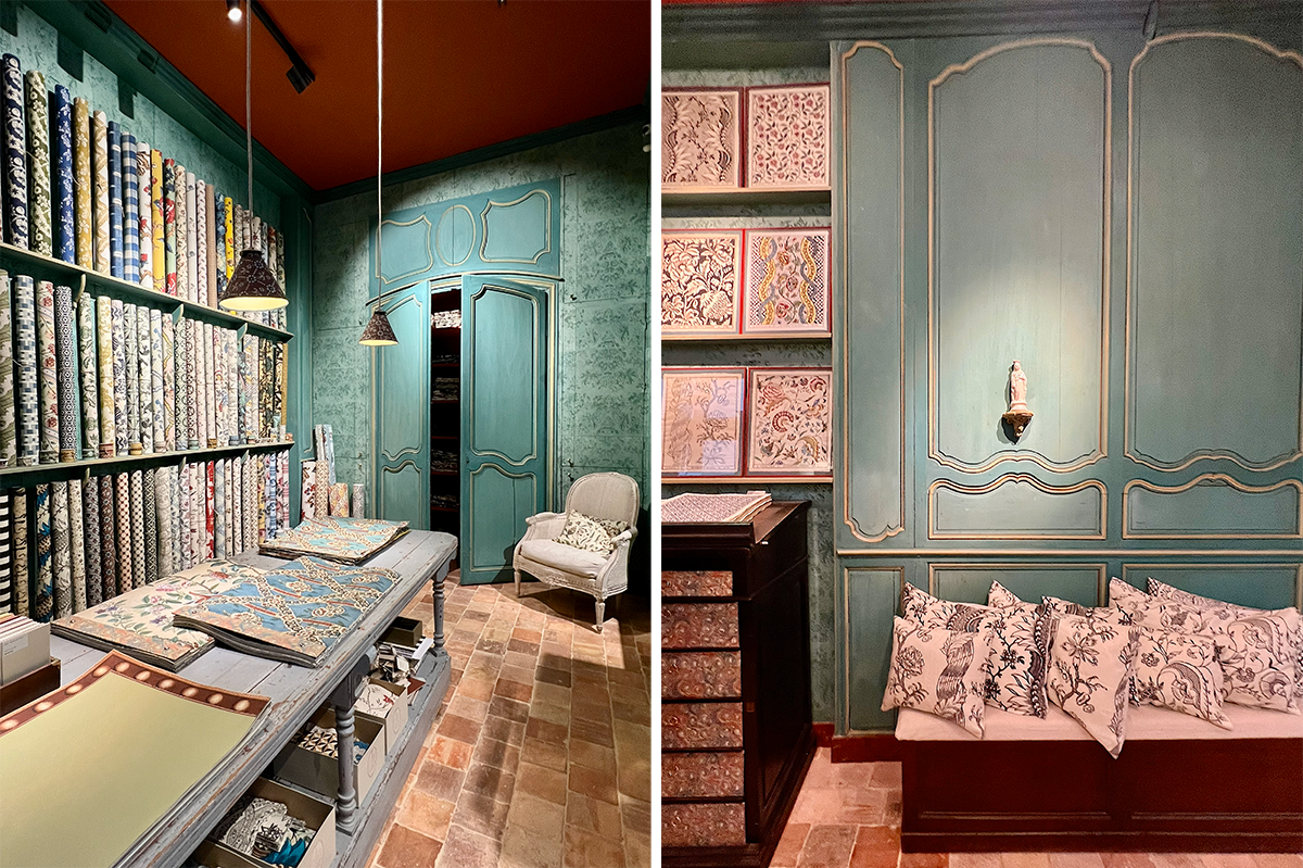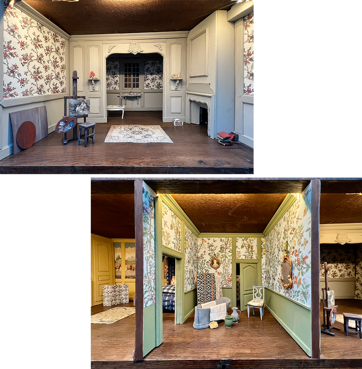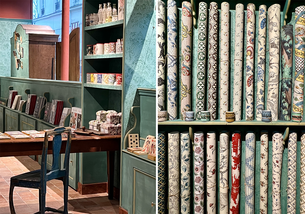ブティックができたのはかつての個人邸宅だった建物の一階で、以前はアートギャラリーだったという横長のスペースである。まずは店に入る前に、ウィンドウを眺めたい。扉の右手のウィンドウを占めるのは18世紀のオランダの開き扉の箪笥の中に作り上げられた”人形の家”。エントランス、キッチン、リビングルーム、バスルーム、ベッドルーム……最上階の3階は広々としたアトリエという一軒家だ。ミニチュアにも関わらず、各部屋にアントワネット・ポワソンの壁紙とカーテンが装飾され、18世紀スタイルの内装が見事に仕上げられている。彼らがブルターニュで暮らす家がインスピレーションだという。1部屋づつじっくり観察すると、これだけで装飾芸術が開花した18世紀にインスパイアされ続けているアントワネット・ポワソンの世界へと連れてゆかれてしまう。でも、さらなるお楽しみが店内で待っているのだ。