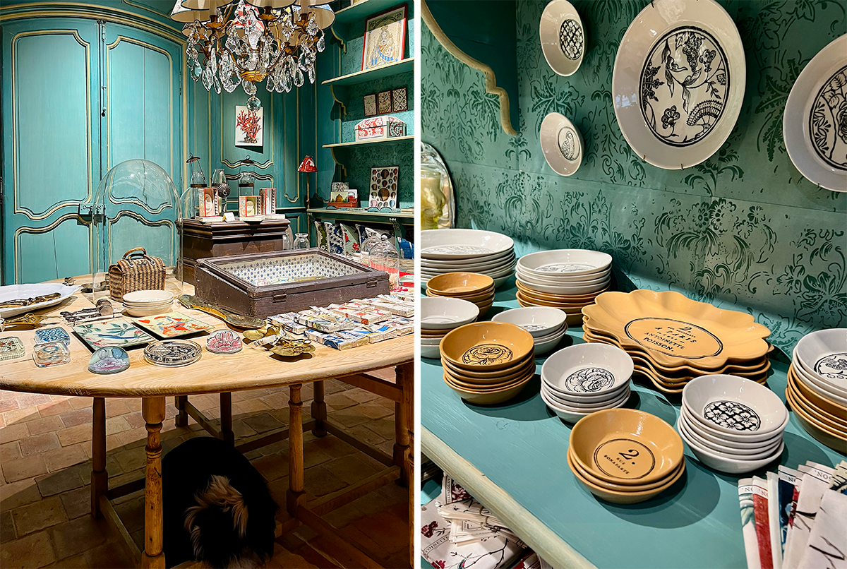 香水、クッション、陶器などオリジナルやコラボレーション品が店内を満たす。テーブルの下に隠れているのは、アントワネット・ポワソンの愛犬。photography: Mariko Omura