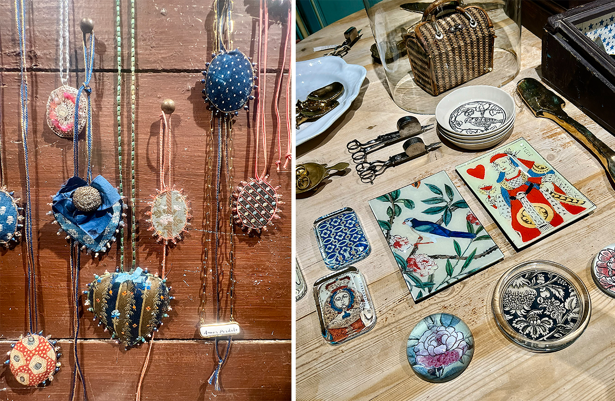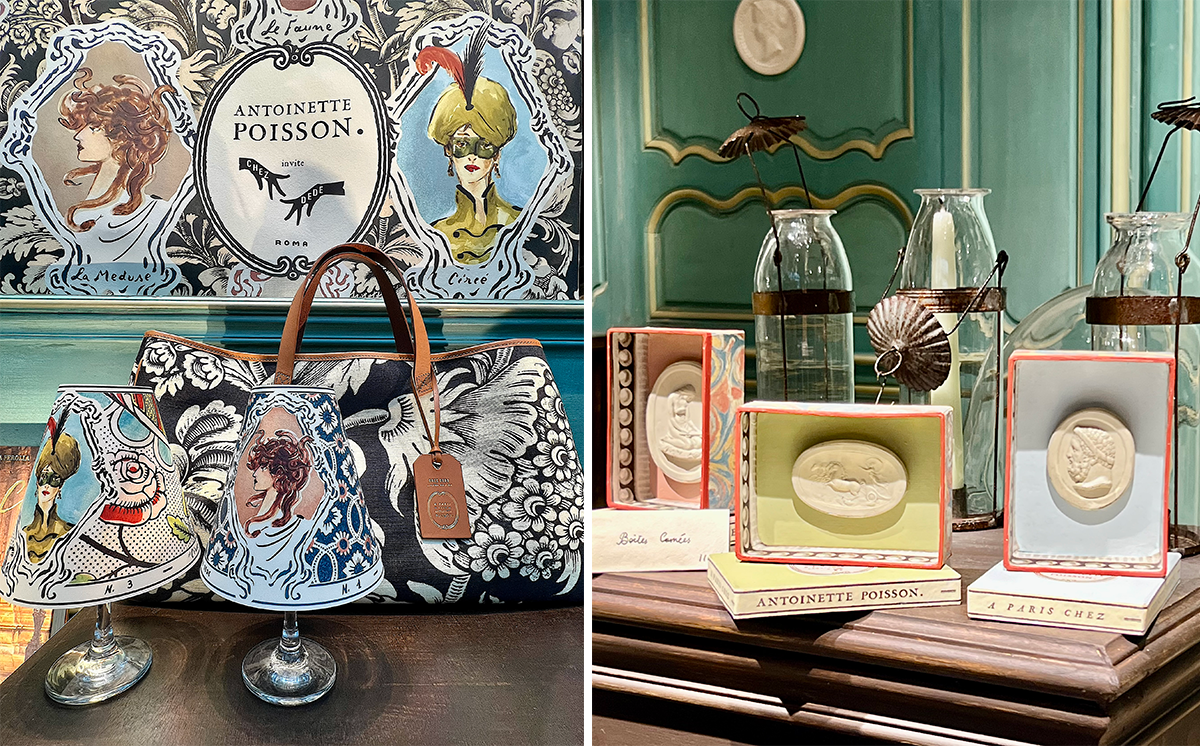 店に入ると目を引くのは、ダマスク織の布のように見えるグリーンの壁紙だ。これはアントワネット・ポワソンでおなじみのドミノペーパーではなく、バスティーユでお隣りだったブロカント店A&Sのアリエルとシドニーが見つけてくれたというモチーフが彫り込まれた18世紀の板を用いてプリント。扉の正面に広がるのはアントワネット・ポワソン&フレンズと呼びたくなる世界。新しい様々なコラボレーション品が新鮮だ。Chez DEDE(シェ・デデ)はダリアとアーチストのアンドレアというクリエイティブデュオによるローマにブティックを持つイタリアのブランドで、彼らとクリエイトしたのはアンドレアのイラストを生かしたグラスキャンドル・シェード、そしてアントワネット・ポワソンのファブリックを用いたchez DEDEの定番バッグとビューティポーチ。どれも旅のお供にぴったりの品だ。ナントのデュオTOP TOPとの陶器のコラボレーションの新作、アントネット・ポワソンの世界を美しい写真に収め続けているルース・リボクールが手がけた18世紀テイストのアクセサリー、ジョン・デリアンとのコラボレーションはアントワネット・ポワソンのファブリクを用いた壁にもかけられるペーパープレス……それにAXSが掘り出したオブジェなどがこの世界に時代の旅をプラスするのだ。
