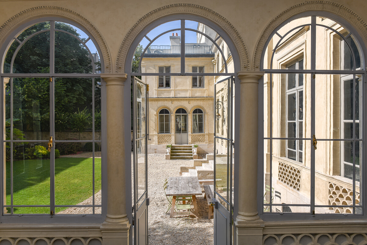 パリ10区のBourrienne Paris Xのブティック。裏手の窓から中庭に面した18世紀の邸宅が見えるが、こちらはオフィスゆえに一般公開はされていない。