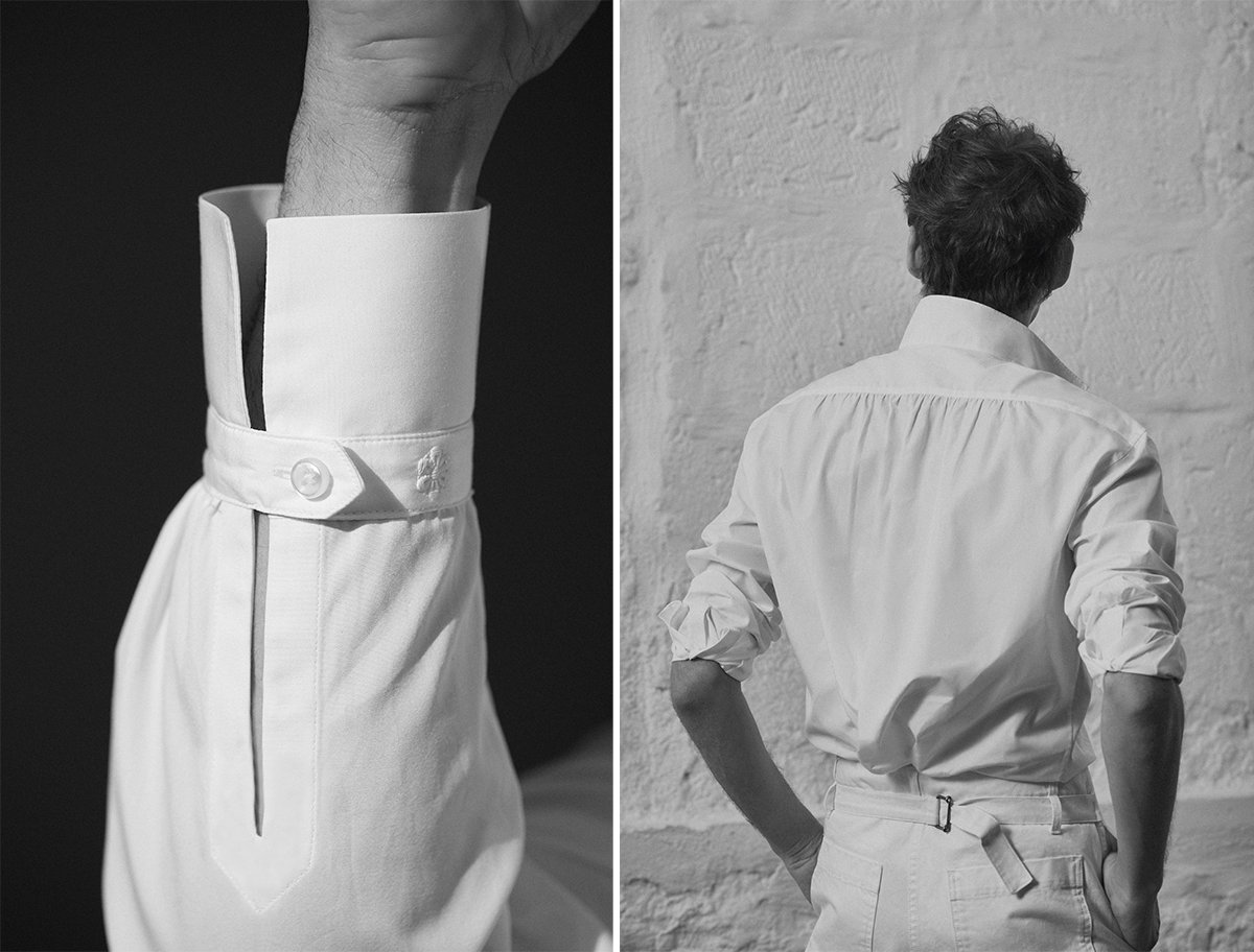 左:白いシャツに袖、襟のバリエーションの遊びが見られるブランド。 右:背中の微妙なタックも職人の技だ。