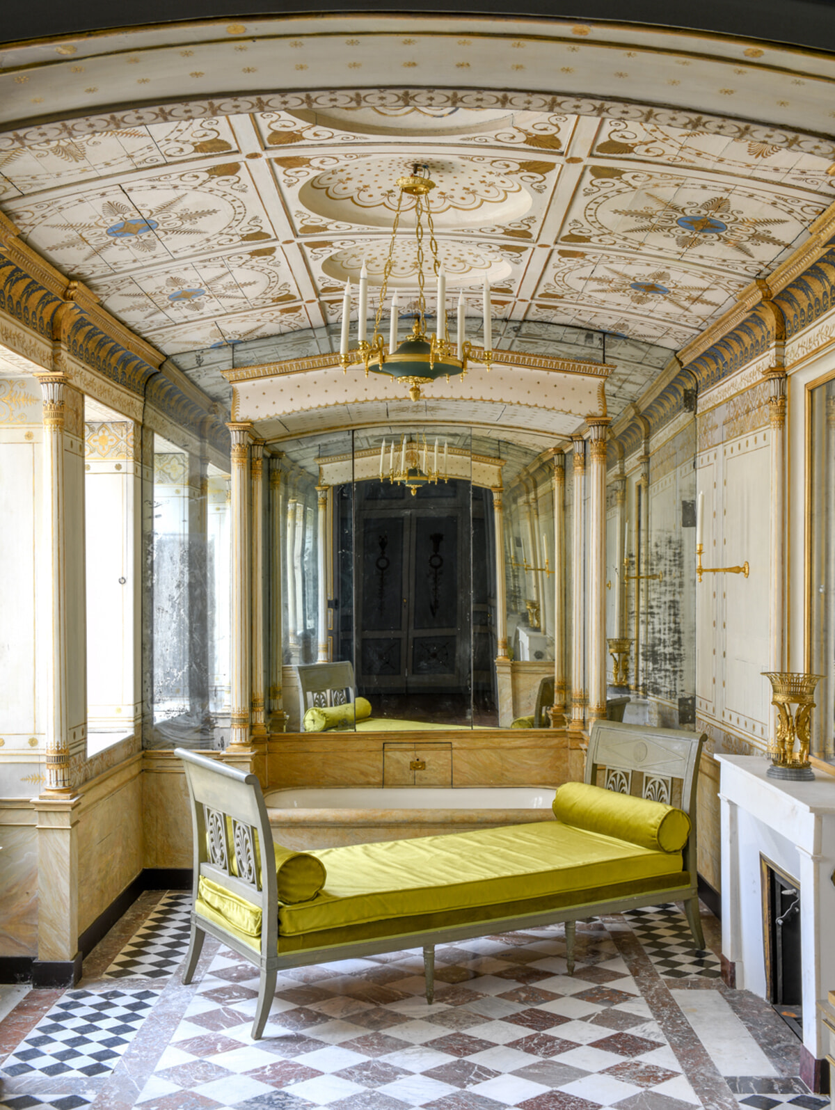 ディレクトワール様式は、高価なゴールドを使う代わりにインテリアに色彩を取り入れていた。ここはかつてフォルチュネの寝室だったスペース。