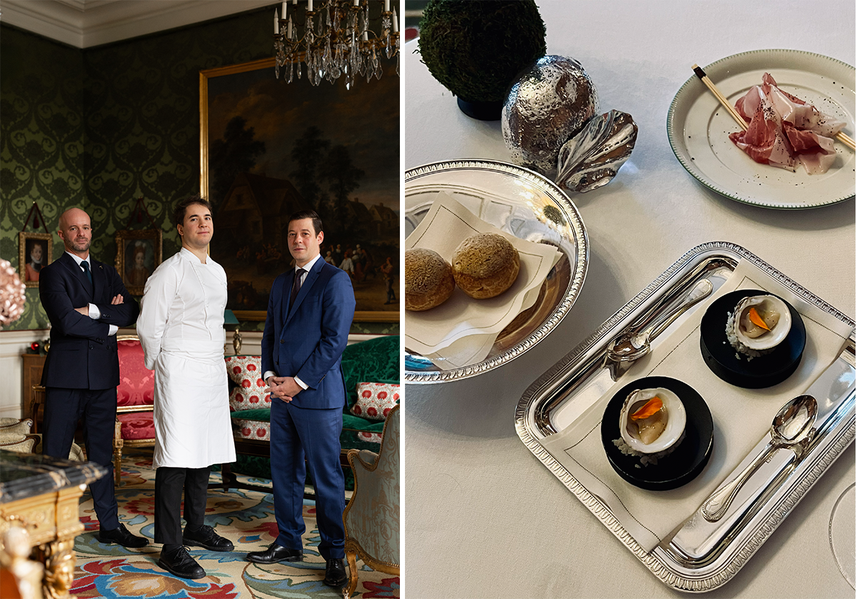 左:レストラン上階のグランドサロンにてシェフのアンドレア・カパソ(中央)、ソムリエのシリル・ボサール(左)、メートル・ドテルのシャルル・ウエイランド。 右:食事の始まりは、海と陸のアミューズ・ブーシュ。photography: 左©Maki Monokian、右 Mariko Omura