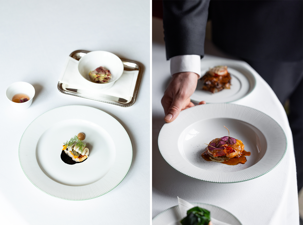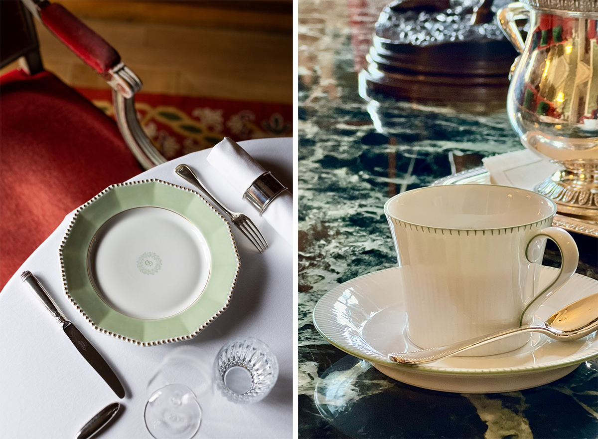 パリのレストランで珍しいドイツの名窯ニンフェンブルグの食器での食事。本物との出会いに食事時間の感動が増す。photography: 左 ©Maki Manoukian、右 Mariko Omura