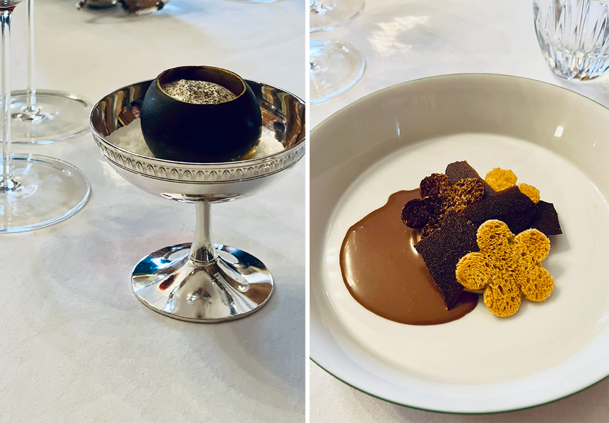 シャフ・パティシエはマキシム・コール。左はプレ・デザートの底にマドレーヌ・ビスケットを隠したシトロン・ジブレ。繊細で程よい酸味が食欲を刺激し、メインのデザートへと。右はそば粉のチュイルとチョコレート。photography: Mariko Omura