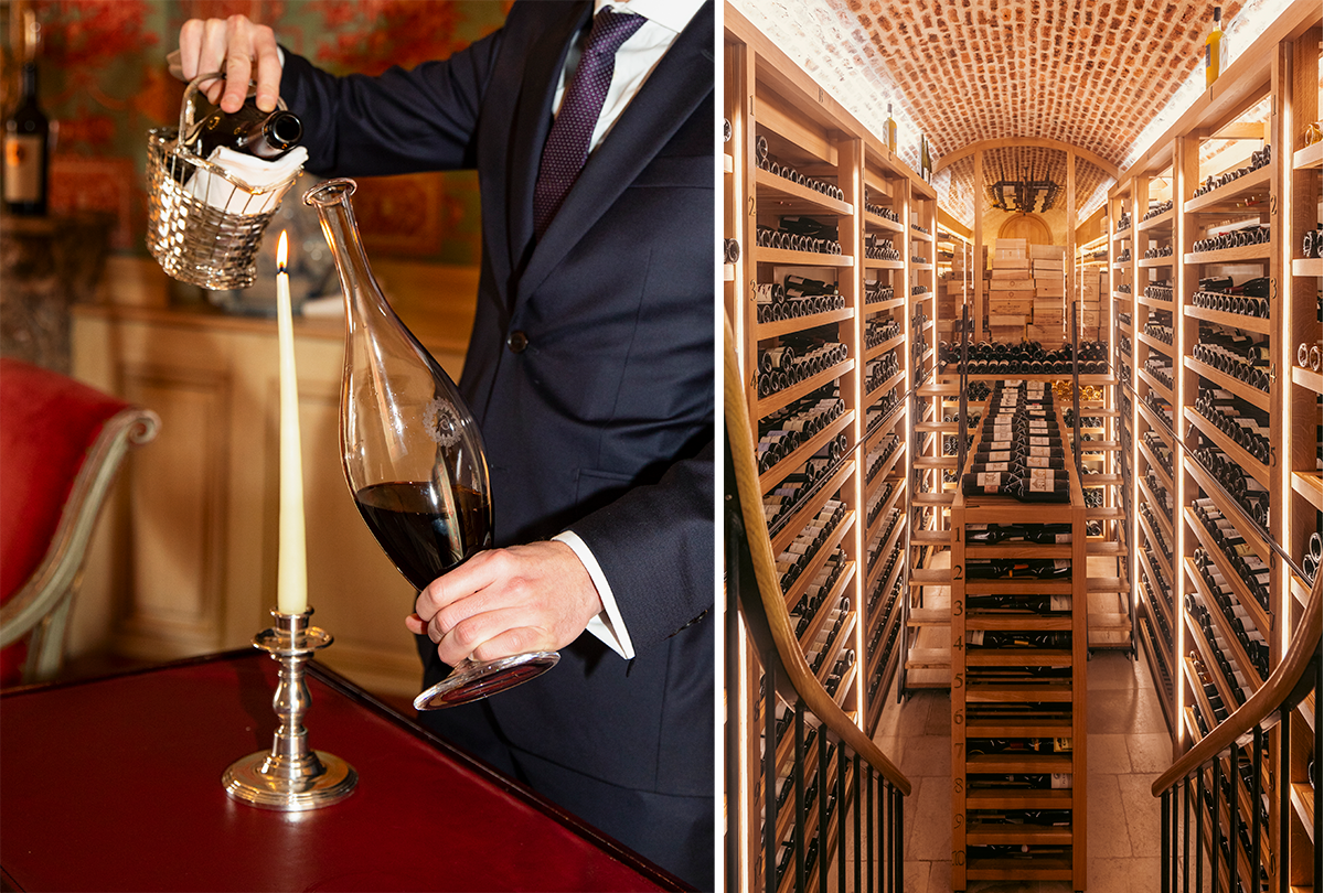 左:ワインシャトーが経営するレストランである。料理とのマリアージュを楽しみたい。 右:レストランの見事なワインセラー。なおレストランの入り口の向かい側には、ワインのブティックがある(火曜から土曜の営業|10:30〜19:30)。photography: 左 ©Clemence Losfeld、右 Valerio Geraci