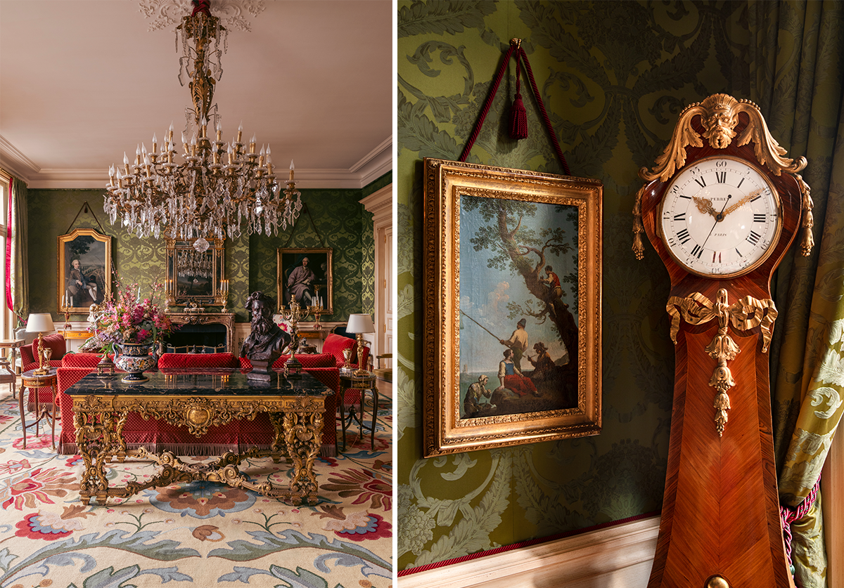 3階のグランド・サロンは18世紀の内装。上質な家具調度品のセレクションに気品が薫る。photography: 左 Valerio Geraci、右 Clemence Losfeld