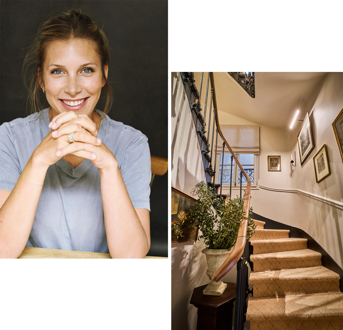 左:内装を手がけたジョアナ・アマトゥリィ。 右:額を飾った階段。ホテルというより個人の家といった雰囲気を彼女は作り上げた。絨毯のひし形モチーフは庭の格子棚からのインスピレーションだ。photography: ©RomainRicard