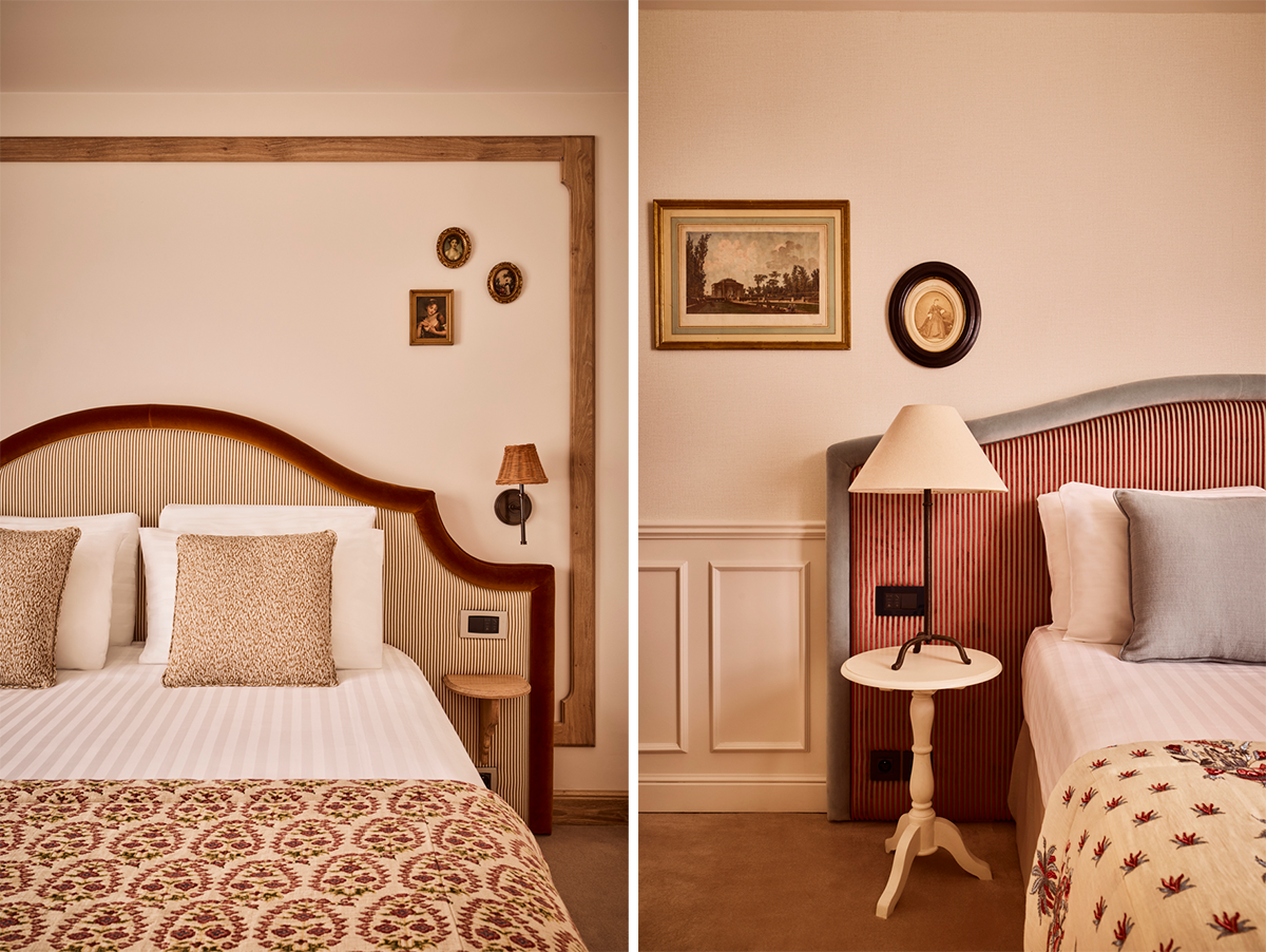 7フロアに振り分けられた24室では、3種の異なるベッドカバーがどれも素敵だ。現在はピエール・フレイ社に属す古いテキスタイルのメゾン、ブラクニエのコレクションからの植物をモチーフにしたクラシックな柄で、ベッドのヘッドボードはそれぞれに合うストライプの布が選ばれている。カーテンを含め、高級メゾンの上品なファブリックでまとめられた室内には気持ち良い寛ぎ感が漂う。バスルームはボルドー色と白のタイルがダミエ模様を描いている。アメニティは庭をイメージさせるということから、フラゴナールのイチジクの花が選ばれた。