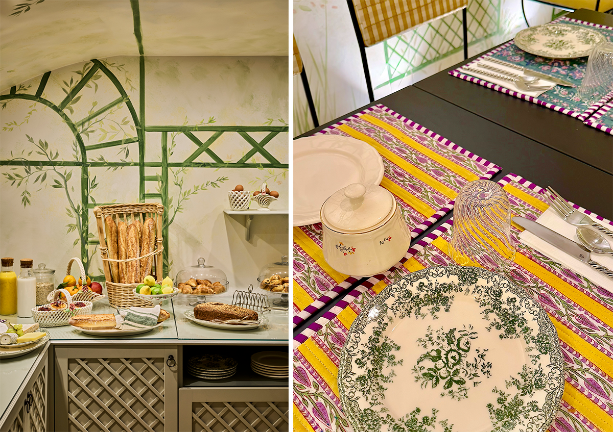 客室の部屋番号は全て手描き。これは装飾アーティストのシャルロット・ボーンによるのだが、彼女は地下の朝食室を庭に変身させるという見事な仕事もこのホテルで行なった。自然の中で朝の時間を味わっている気がする空間。食卓には庭を感じさせるビュッフェ朝食のための食器やテーブルマットが。朝のせわしなさを忘れ、ゆったりとした気持ちで1日をスタートできる。