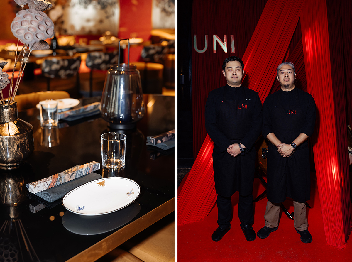 日本だけでなくアジア諸国が作り上げる和食店ウニ。シェフはシンガポール人のアクマル・アニュアール、エグゼクティブシェフはディミトリ・パク。photography: 左 ©Pavel Gulian、右 ©CyrielleGiot