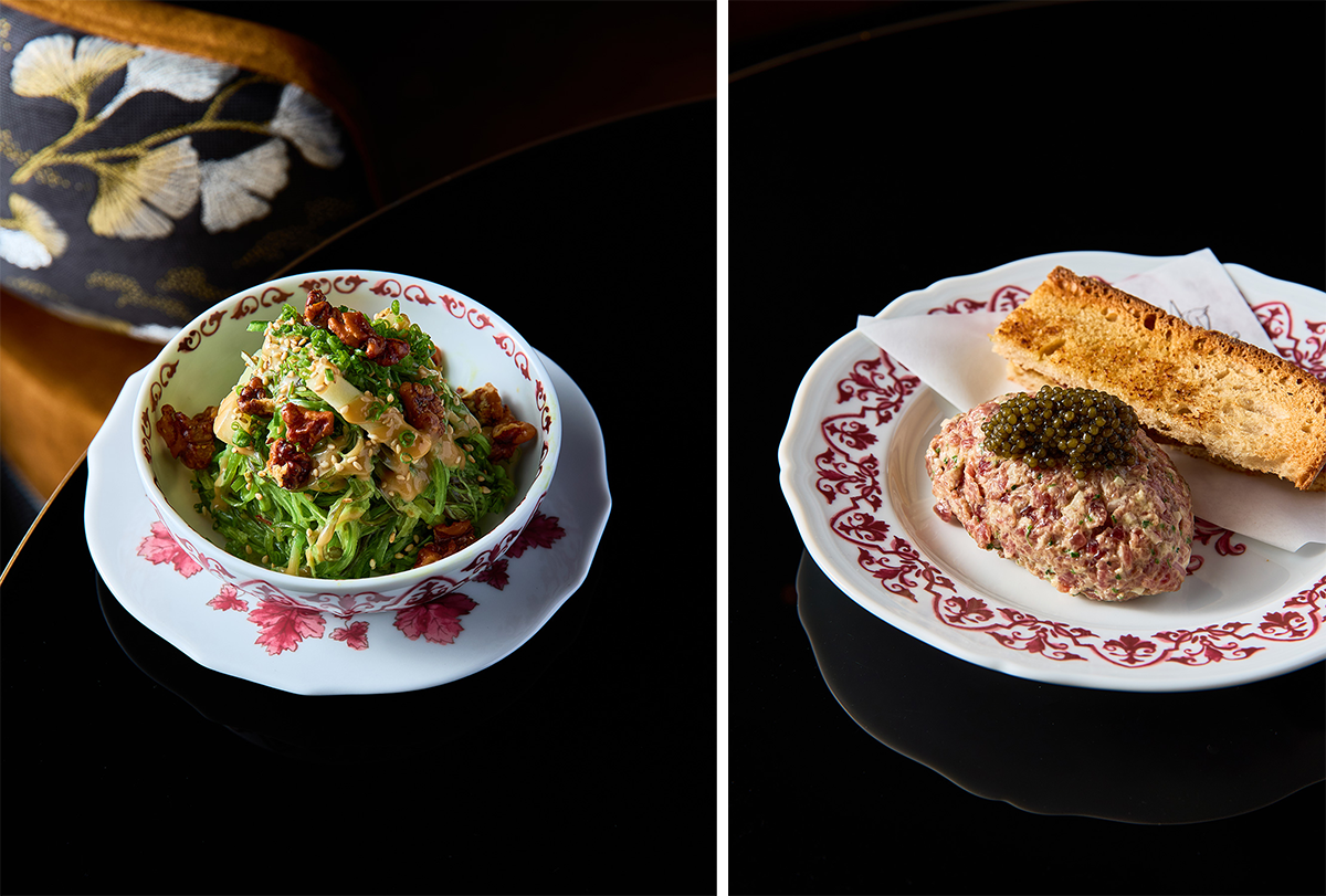 左:海藻のサラダ。 右:前菜のパン・オ・ルヴァンのトーストを添えた牛肉のタルタル。キャビアはオプション。©Pavel Gulian ©Pavel Gulian