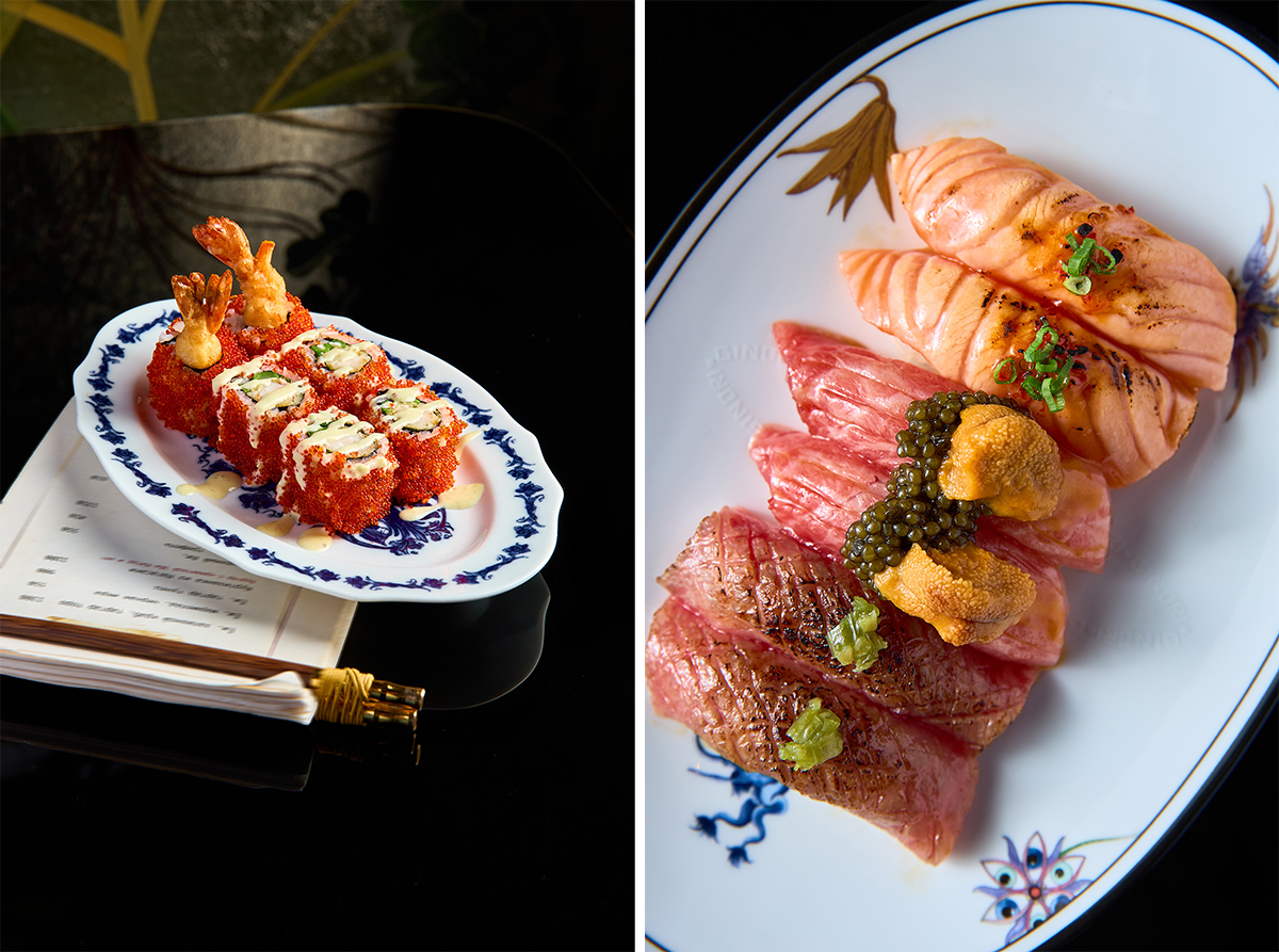 左:エビの天ぷらの寿司ロール。 右:握り。キャビアやウニは追加で。©Pavel Gulian