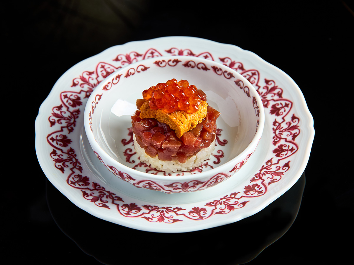 シグネチャー料理のひとつ、ウニとイクラを乗せたマグロのタルタル。©Pavel Gulian