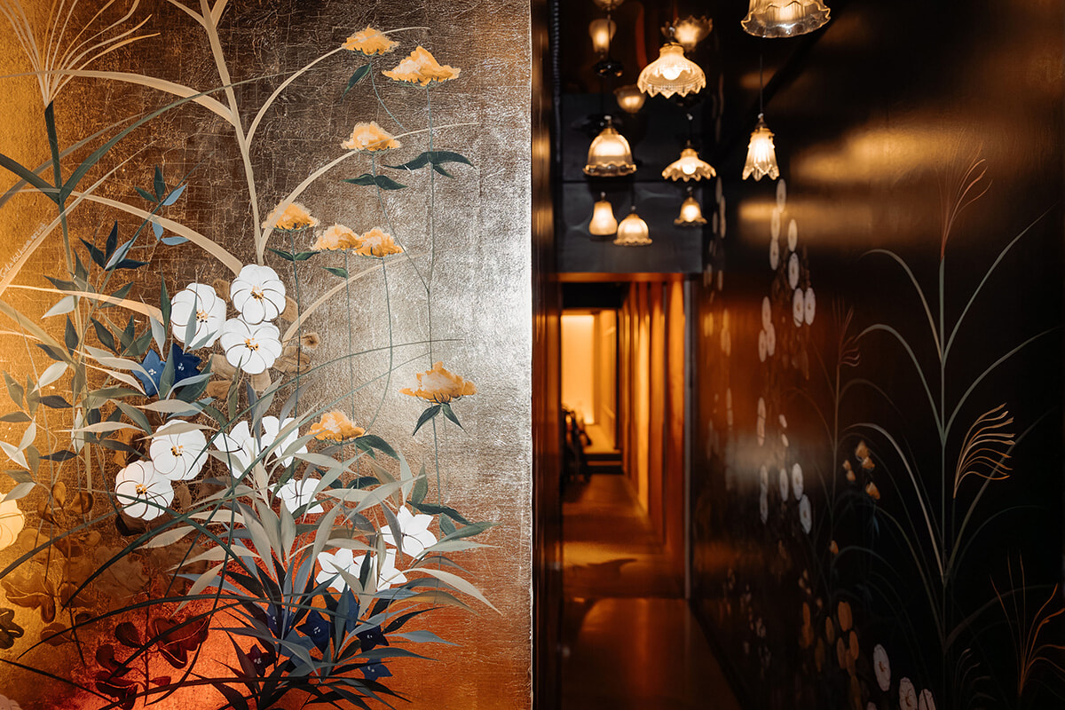 それはインテリアにも言えること。マルゴーとマキシムというデュオによる建築事務所の2M Architecture Intérieureが手がけた印籠がコンセプトという内装は、まるで日本を舞台にした映画のセットのよう。レストラン内は大きく3パートに分かれ、それぞれ凝ったインテリアだ。御所や貴族の家をイメージに、これでもかというほど日本色が盛り込まれている。パリの中心部ゴールデン・トライアングルで食事をしていることを忘れさせる空間である。この雰囲気、外からは感じられず。レストランを探して番地にたどり着いても、ちょっとそっけないファサードなので通り過ぎてしまうかも。それだけに、扉をあけて目の前に広がる日本的光景に驚かされるという仕掛けだ。