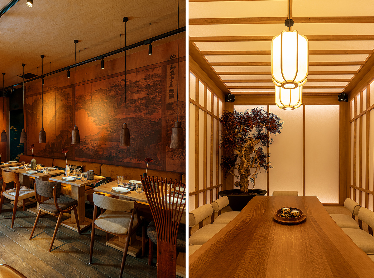 左:寿司カウンター7席を含む20席の奥の部屋。 右:貸切用のプライベートサロンは和室風。©Pavel Gulian