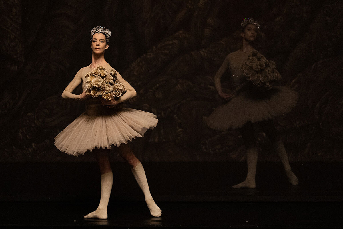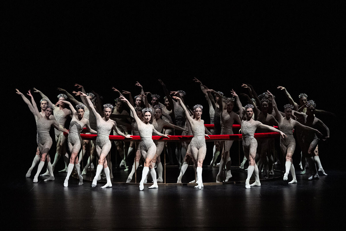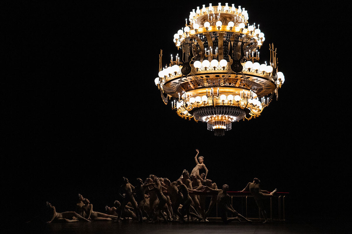 マルコス・モローはパリ・オペラ座バレエ団のアイコニックな要素を作品に盛り込み、ダンスの世界の果てしない日々の美の追求をテーマに創作した。男女31名のコスチュームはチュチュとティアラとハイソックス・シューズで、ボレロの赤い円卓を想起させる赤い円の中でダンサーたちは同じ動きを繰り返す。時に、『エチュード』『Seasons’ Canon』を思わせる振り付けも。ドガの作品にインスパイアされたと思われるシーンは、照明の仕事でダンサーの身体が2次元のようでまるで絵画のよう。オペラ・ガルニエを象徴する巨大なシャンデリアもステージに登場し、後方の壁がミラーとなると客席がステージ上に映し出される。最後はステージ後ろの仕切りが取り払われ、ダンサーたちのデフィレでおなじみのシャンデリアが輝くフォワイエ・ドゥ・ラ・ダンスが姿を現す仕掛けだ。音楽は振り付けと同時進行でGustaveが作曲した。