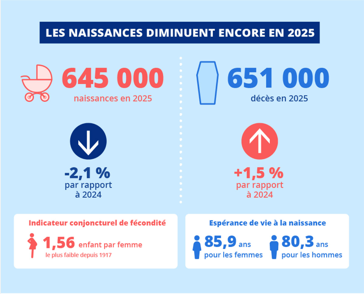 INSEEが1月13日に発表した2025年の人口統計リポートでは、わかりやすい図式で鍵となる数字が示された。出生はベビーカー、死者数は棺で表している。女性1人あたりの子どもの数は1917年以来最も低い1.56人。出生数が減り、死者数が増えている。