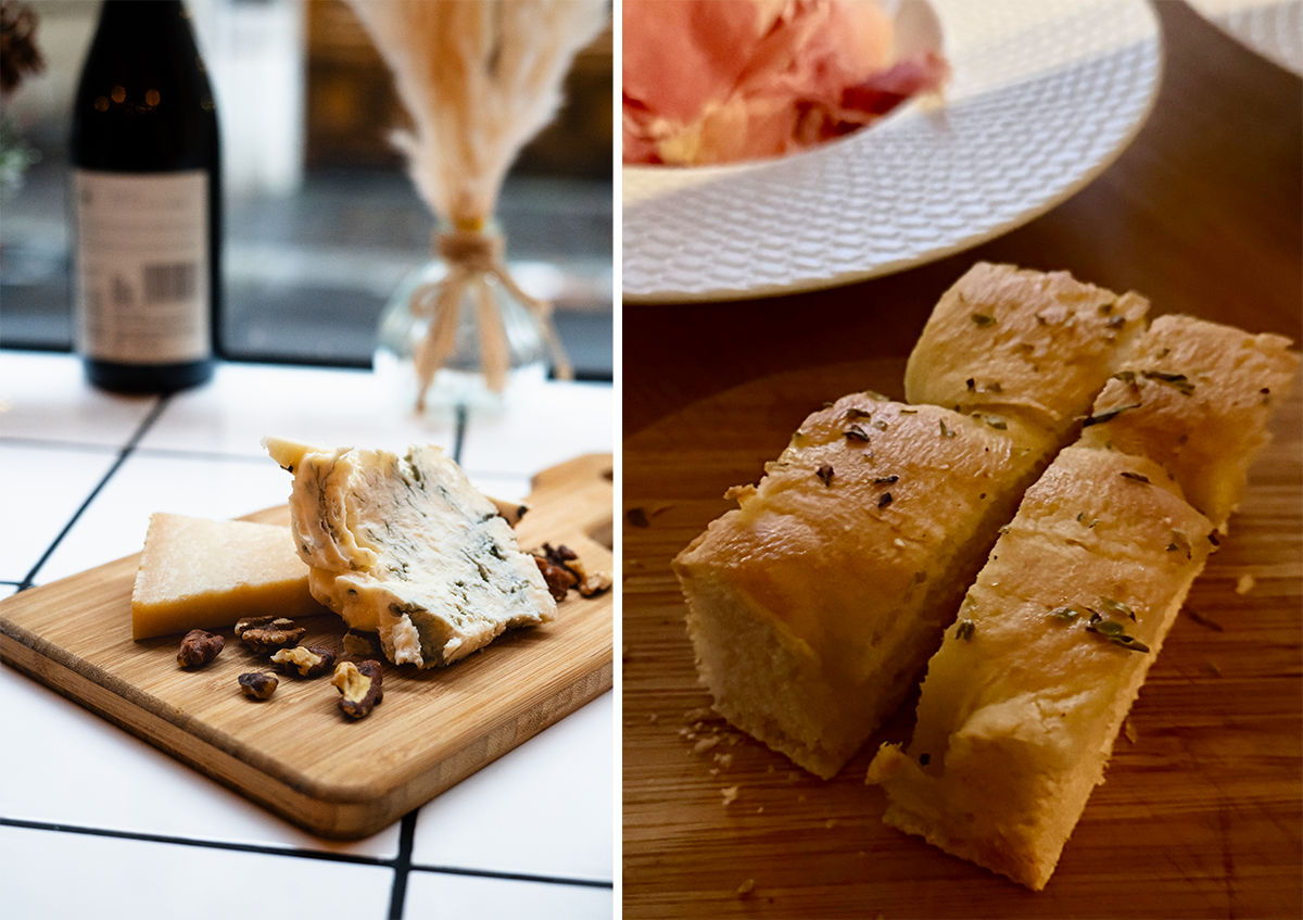 左:イタリアチーズの盛り合わせ。 右:ホームメイドの温かいホカッチャ(3ユーロ)とジャンボン・ドゥ・パルム(10ユーロ)。photography: 左 ©Mathilde Elizechea、右 Mariko Omura
