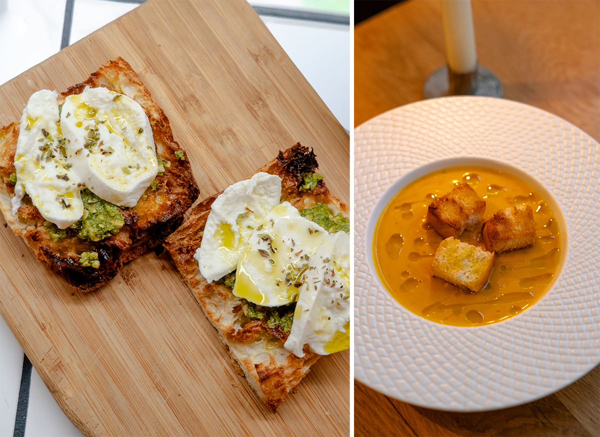 左:モッツアレラと生ハムを乗せたブルスケッタ。 右:本日のポタージュ。photography: ©Mathilde Elizechea