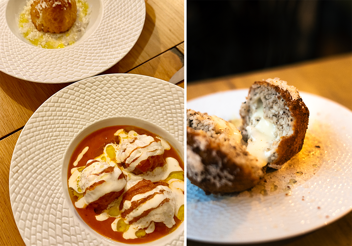左:とろけるおいしさのミートボール(ポルペット)。右: 左の写真の後方のアランチーノは、ナイフを入れるとトリュフが香る。photography: 左 Mariko Omura、右 ©Mathilde Elizechea