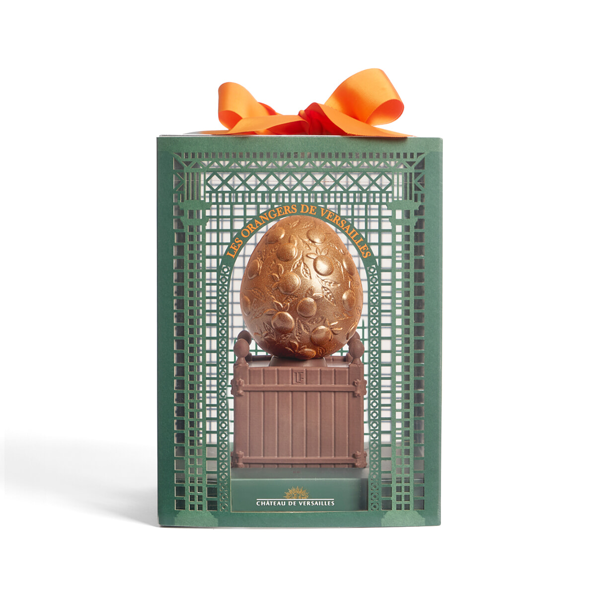 そのルイ・フーケの今年のイースター・コレクションは、ヴェルサイユ宮殿とのコラボレーションだ。チョコレートで再現されたのは、庭園内のオランジュリー(箱植えオレンジのための温室)でおなじみの、植木箱とオレンジの樹。この植木箱はオランジュリーを設計したアンドレ・ル・ノートルのデザインで、それをチョコレートで再現した中には、イースターのチョコレートになくてはならない”フリチュール”として中にキャラメライズされたグラン・クリュ・チョコレートでコーティングされたパフライスボールが隠されている。