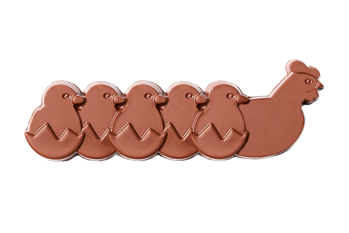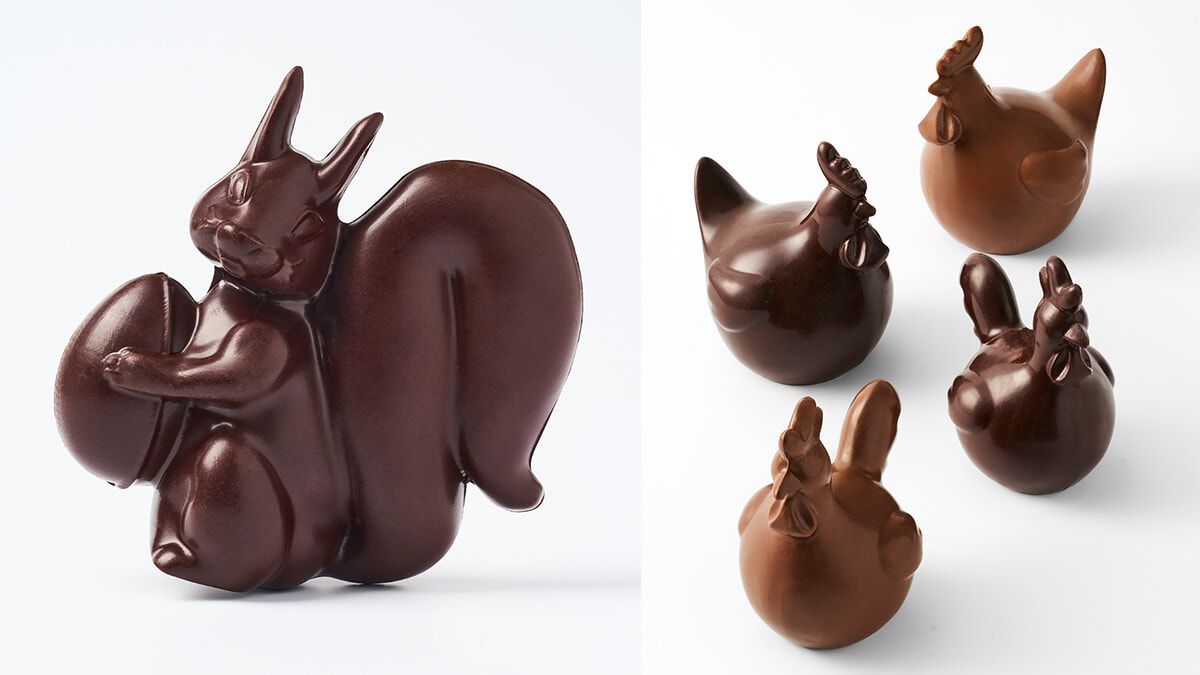 左:マスコットのリス。中にはフリチュールが。ブラックとミルクの2種あり。24ユーロ(150グラム)。 右:イースターにおなじみの鶏は2サイズあり、それぞれミルクとブラックが。30ユーロ(200グラム)、45ユーロ(300グラム)。