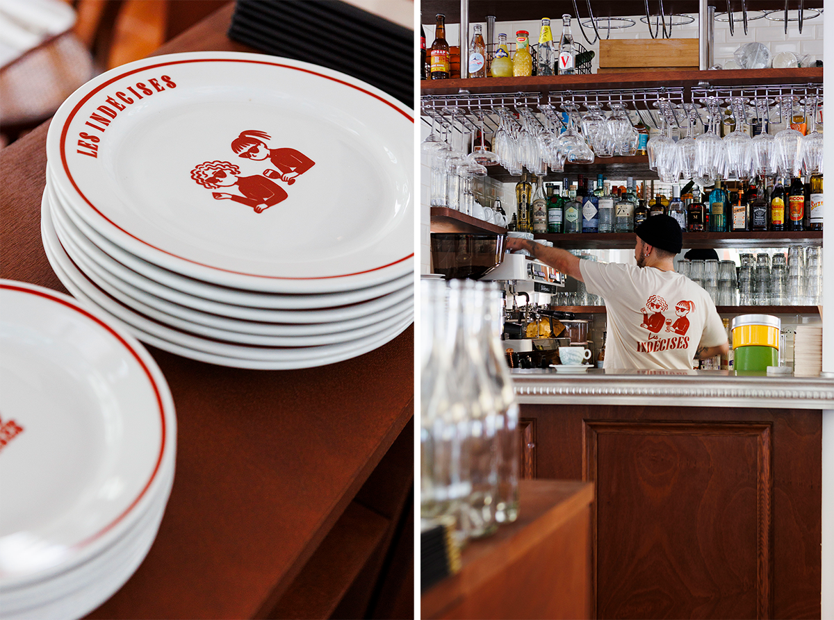 最寄り地下鉄駅は8番線のLa Fille du calvaire。トロワ・ボルヌ通りとジャン=ピエール・タンボー通りのコーナーに、50年以上も前から地元民におなじみのレストランがある。昨年秋、お向かいの建物で育ち、界隈のビストロで料理修行を始めたというニコラ・シュヴェリがアソシエのステファン・キルシュとともにオーナーとなった。その際にLes petites indécisesからプティットが省かれ、店名はLes indécises(レザンデシーズ)に。大改装が行われ、亜鉛のしっかりとしたバーカウンター、テラス席にはメゾン・ガティのビストロチェアなどいかにもパリのカフェやブラッスリーといった要素が店にもたらされた。